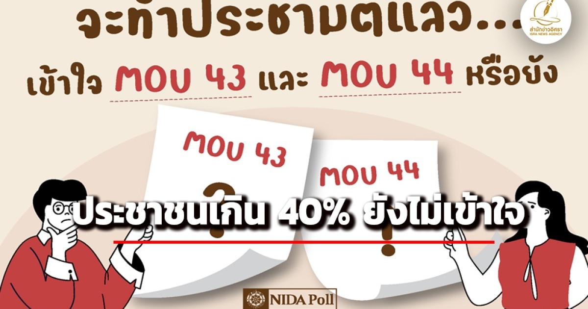สำนักข่าวอิศรา (www.isranews.org) รายงานว่าศูนย์สำรวจความคิดเห็น “นิด้าโพล” สถาบันบัณฑิตพัฒนบริหารศาสตร์ (นิด้า) เปิดเผยผลการสำรวจเรื่อง “จะทำประชามติแล้ว…เข้าใจ MOU 43 และ MOU 44 หรือยัง” ทำการสำรวจระหว่างวันที่ 1-2 ตุลาคม 2568 จากประชาชนที่มีอายุ 18 ปีขึ้นไป กระจายทุกภูมิภาค ระดับการศึกษา อาชีพ และรายได้ ทั่วประเทศ รวมจำนวนทั้งสิ้น 1,310 หน่วยตัวอย่าง เกี่ยวกับความเข้าใจของประชาชนต่อ MOU 43 และ MOU 44 ก่อนการทำประชามติ การสำรวจอาศัยการสุ่มตัวอย่างโดยใช้ความน่าจะเป็นจากบัญชีรายชื่อฐานข้อมูลตัวอย่างหลัก (Master Sample) ของ “นิด้าโพล” สุ่มตัวอย่างแบบหลายขั้นตอน (Multi-stage Sampling) เก็บข้อมูลด้วยวิธีการสัมภาษณ์ทางโทรศัพท์ โดยกำหนดค่าความคลาดเคลื่อนไม่เกิน 0.05 ที่ระดับความเชื่อมั่น ร้อยละ 97.0
