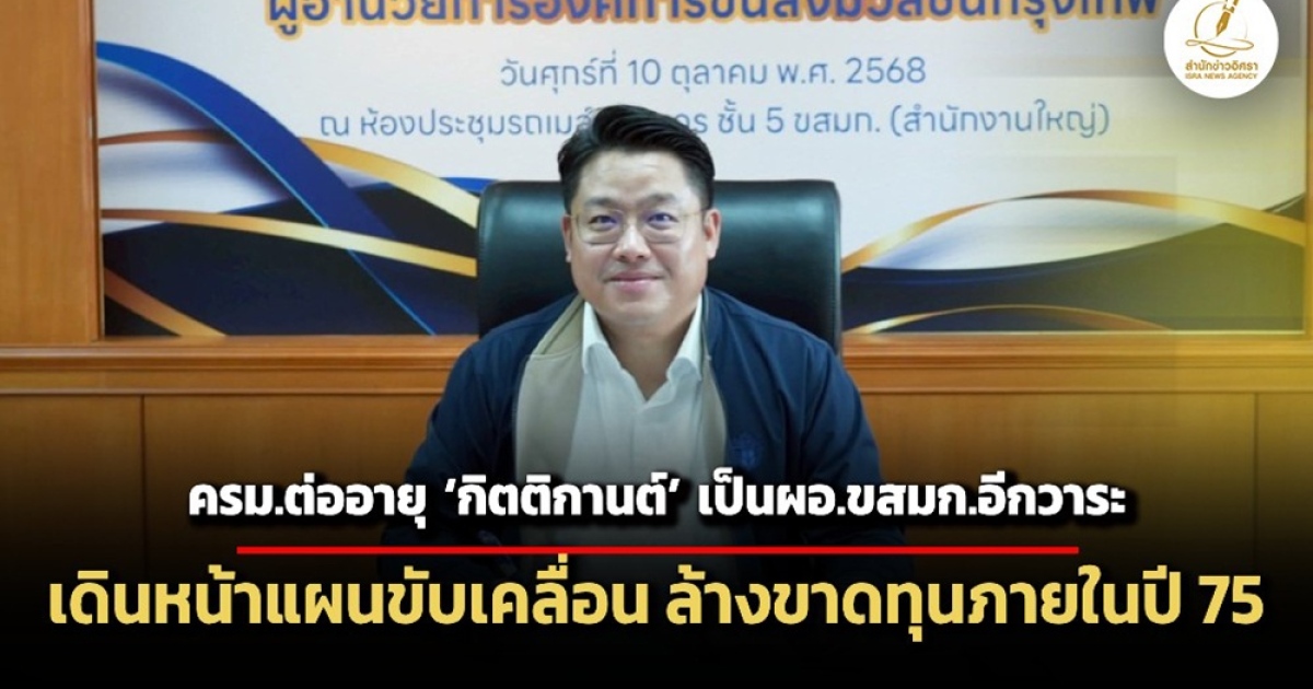ครม.อนุมัติแต่งตั้ง ‘กิตติกานต์ จอมดวง จารุวรพลกุล’ เป็นผอ.ขสมก.อีก 1 วาระ เผยเจ้าตัวเข้ารับตำแหน่งอย่างเป็นทางการเมื่อวันที่ 10 ต.ค.ที่ผ่านมา ยันเดินหน้าแผนขับเคลื่อนองค์การฯตามแนวการฟื้นฟูกิจการ ประกาศภายในปี 75 EBITDA ฟื้นเป็นบวก