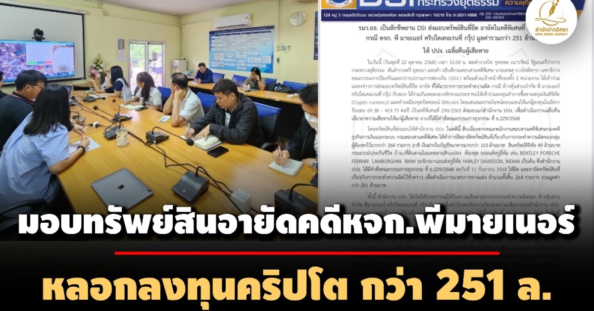 สำนักข่าวอิศรา (www.isranews.org) รายงานว่า เมื่อวันที่ 22 ตุลาคม 2568 เวลา 10.00 น. พลตำรวจโท รุทธพล เนาวรัตน์ รัฐมนตรีว่าการกระทรวงยุติธรรม พันตำรวจตรี ยุทธนา แพรดำ อธิบดีกรมสอบสวนคดีพิเศษ นายเทพสุ บวรโชติดารา เลขาธิการคณะกรรมการป้องกันและปราบปรามการฟอกเงิน (ปปง.) พร้อมด้วยเจ้าหน้าที่ของทั้ง 2 หน่วยงาน ได้เข้าร่วมแถลงข่าวการส่งมอบทรัพย์สินที่ยึด อายัด ที่ได้มาจากการกระทำความผิด กรณี ห้างหุ้นส่วนจำกัด พี มายเนอร์ คริปโตเคอเรนซี่ กรุ๊ป กับพวก ได้ร่วมกันหลอกลวงชักชวนประชาชนให้เข้าร่วมลงทุนทำการซื้อขายสกุลเงินดิจิทัล (Crypto currency) และทำเหมืองขุดบิตคอยน์ (Bitcoin) โดยเสนอผลประโยชน์ตอบแทนให้แก่ผู้ลงทุนในอัตราร้อยละ 69.38 – 419.75 ต่อปี เป็นคดีพิเศษที่ 290/2565 ส่งมอบแก่สำนักงาน ปปง. เพื่อดำเนินการเฉลี่ยคืนเยียวยาความเสียหายให้แก่ผู้เสียหาย ตามที่ได้มีคำสั่งคณะกรรมการธุรกรรม ที่ ย.229/2568