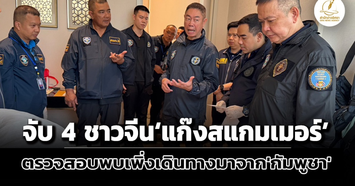 ‘ผู้ช่วย ผบ.ตร.’ นำกำลังตำรวจบุกจับ 4 ชาวจีน ‘แก๊งสแกมเมอร์’ ใช้นวัตกรรม AI หลอกเหยื่อ ยึด ‘คอมพิวเตอร์-โน้ตบุ๊ค’ พร้อมโทรศัพท์มือถือ 60 เครื่อง ยาไอซ์ 22 ถุง ตรวจสอบพบเพิ่งเดินทางจากกัมพูชา