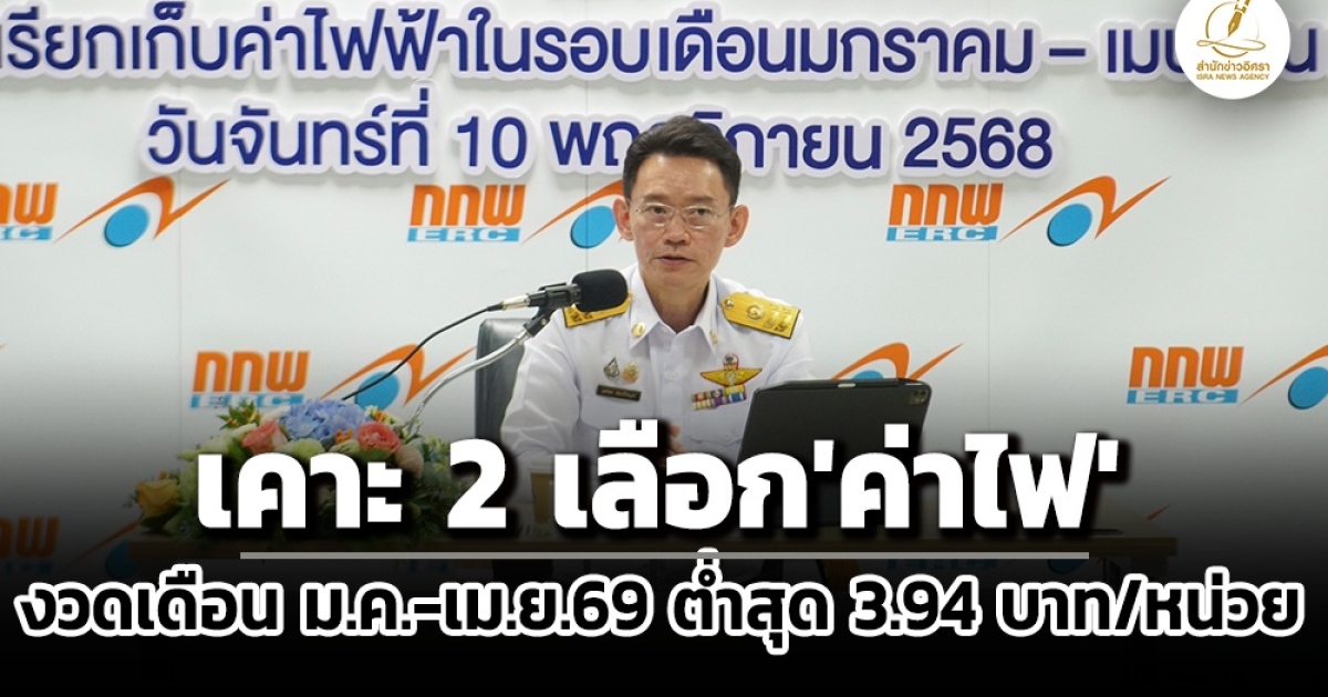‘กกพ.’เคาะเสนอ 2 ทางเลือกค่าไฟฟ้างวด ม.ค.-เม.ย.69 ต่ำสุด 4.58 บาท/หน่วย สูงสุดไม่เกิน 3.94 บาท/หน่วย หลังต้นทุน ‘ค่าเชื้อเพลิง’ คลายตัว พร้อมทยอยคืน 'หนี้คงค้าง' สร้างเสถียรภาพ-ความมั่นคงให้ระบบ