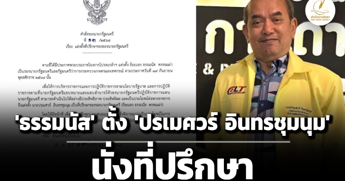 สำนักข่าวอิศรา (www.isranews.org) รายงานว่า เมื่อวันที่ 18 พ.ย. 2568 ร.อ.ธรรมนัส พรหมเผ่า รองนายกรัฐมนตรีและรัฐมนตรีว่าการกระทรวงเกษตรและสหกรณ์ มีคำสั่งแต่งตั้ง นายปรเมศวร์ อินทรชุมนุม เป็นที่ปรึกษาของรองนายกรัฐมนตรี (ร้อยเอก ธรรมนัส พรหมเผ่า)