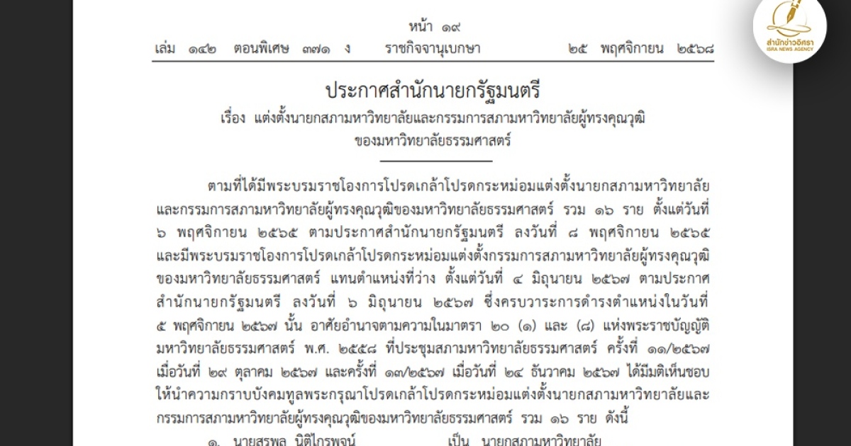 สำนักข่าวอิศรา (www.isranews.org) รายงานว่าเมื่อวันที่ 25 พฤศจิกายน 2568เว็บไซต์ราชกิจจานุเบกษา ได้มีการเผยแพร่ประกาศสํานักนายกรัฐมนตรีเรื่อง แต่งตั้งนายกสภามหาวิทยาลัยและกรรมการสภามหาวิทยาลัยผู้ทรงคุณวุฒิ