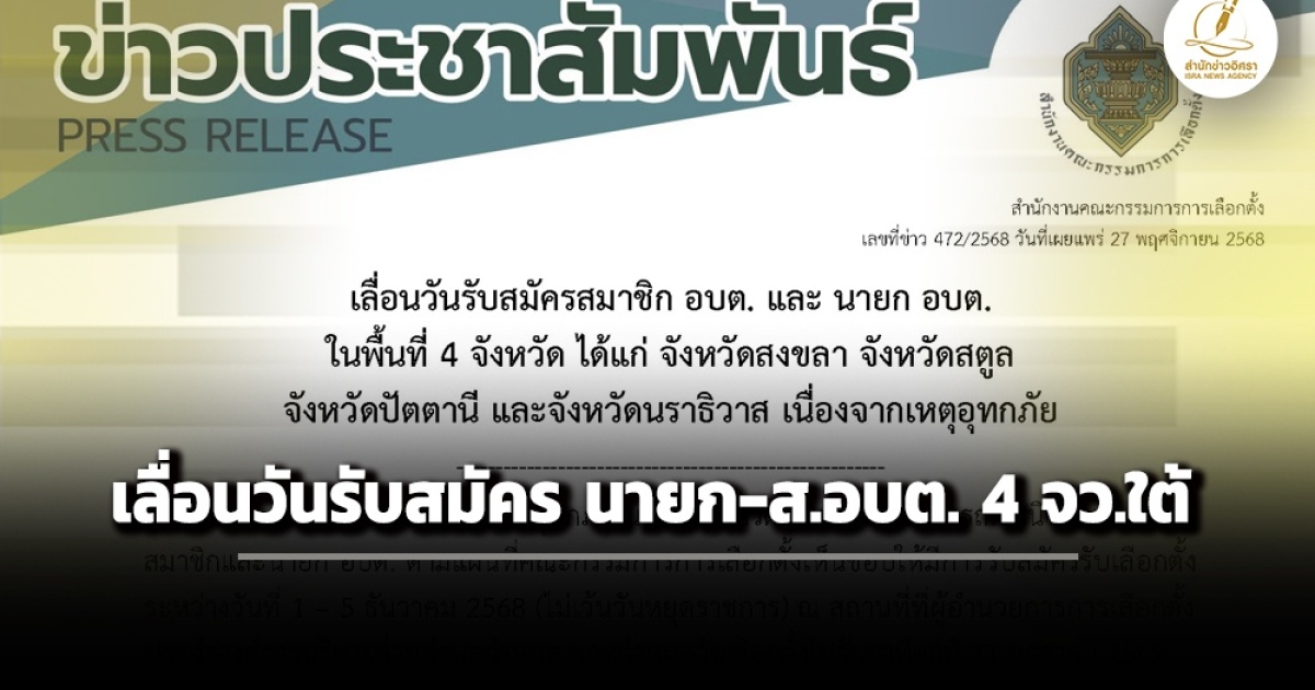 สำนักข่าวอิศรา (www.isranews.org) รายงานว่า วันที่ 27 พฤศจิกายน 2568 สำนักงานคณะกรรมการการเลือกตั้ง (กกต.) เผยแพร่ ข่าวประชาสัมพันธ์ (PRESS RELEASE) เลขที่ข่าว 472/2568 ประกาศเลื่อนวันรับสมัครสมาชิกองค์การบริหารส่วนตำบล (อบต.) และ นายก อบต. ในพื้นที่ 4 จังหวัด ได้แก่ จังหวัดสงขลา จังหวัดสตูล จังหวัดปัตตานี และจังหวัดนราธิวาส จากเดิมวันที่ 1-5 ธ.ค.68 (ไม่เว้นวันหยุดราชการ) และกำหนดวันเลือกตั้งวันที่ 11 ม.ค.69 โดยให้รับสมัครในวันที่ 8-12 ธ.ค.68 เนื่องจากเหตุอุทกภัย โดยมีรายละเอียด ดังต่อไปนี้