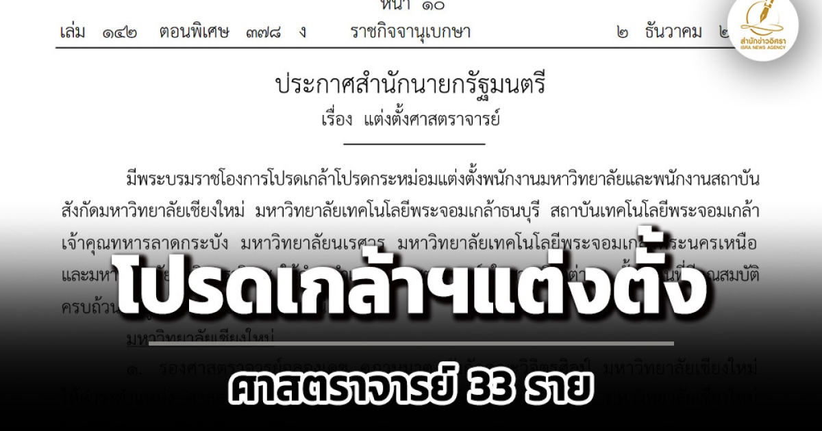 สำนักข่าวอิศรา (www.isranews.org) รายงานว่า เมื่อวันที่ 2 ธ.ค. 2568 ราชกิจจานุเบกษา เผยแพร่ ประกาศสำนักนายกรัฐมนตรี 3 ฉบับ เรื่อง แต่งตั้งศาสตราจารย์ รวม 33 ราย จาก 14 มหาวิทยาลัย โดยมีนายโสภณ ซารัมย์ รองนายกรัฐมนตรี เป็นผู้รับสนองพระบรมราชโองการ