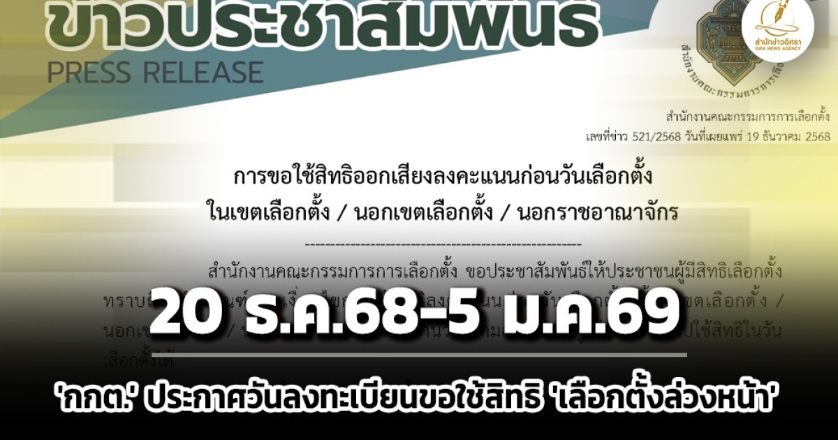 'กกต.' ประกาศกำหนดวันลงทะเบียนขอใช้สิทธิออกเสียง 'เลือกตั้งล่วงหน้า' ในเขตเลือกตั้ง-นอกเขตเลือกตั้ง-นอกราชอาณาจักร 3 ช่องทาง-ผู้มีสิทธิ ระหว่างวันที่ 20 ธ.ค.68 – 5 ม.ค.69
