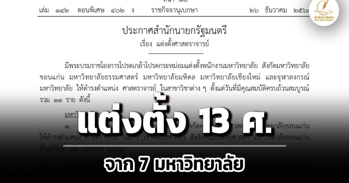 ราชกิจจาฯ แพร่ประกาศสำนักนายกรัฐมนตรี โปรดเกล้าฯ แต่งตั้งศาสตราจารย์ จำนวน 13 ราย จาก 7 มหาวิทยาลัย