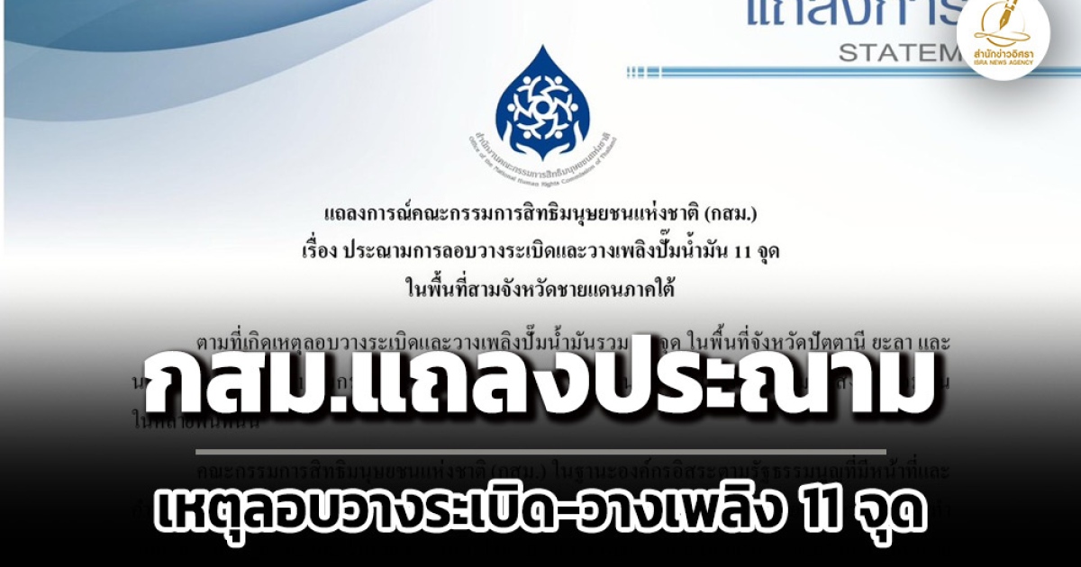กสม.แถลงการณ์ประณามการลอบวางระเบิดและวางเพลิงปั๊มน้ำมัน 11 จุด ใน 3 จังหวัดชายแดนภาคใต้ ชี้เป็นการกระทำละเมิดสิทธิมนุษยชนอย่างร้ายแรง ซ้ำเติมความทุกข์ยาก