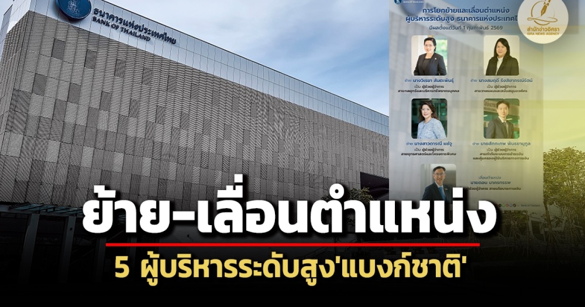 เมื่อวันที่ 28 ม.ค. นายจิรานุวัฒน์ ธัญญะเจริญ เลขานุการ คณะกรรมการธนาคารแห่งประเทศไทย (บอร์ด ธปท.) เปิดเผยว่าคณะกรรมการฯ เห็นชอบการโยกย้ายและเลื่อนตำแหน่งผู้บริหารระดับสูง ภายใต้การปรับโครงสร้างองค์กร เพื่อเพิ่มประสิทธิภาพการดำเนินงานและเตรียมความพร้อมรองรับความท้าทายในระยะข้างหน้า โดยให้มีผลตั้งแต่วันที่ 1 กุมภาพันธ์ 2569 ดังนี้