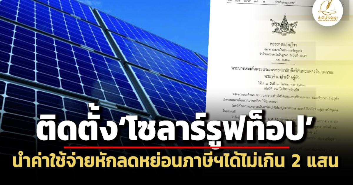 สำนักข่าวอิศรา (www.isranews.org) รายงานว่า เมื่อวันที่ 2 มี.ค.ที่ผ่านมา เว็บไซต์ราชกิจจานุเบกษา เผยแพร่ พ.ร.ฎ.ออกตามความในประมวลรัษฎากรว่าด้วยการยกเว้นรัษฎากร (ฉบับที่ 805) พ.ศ.2569 ซึ่งมีสาระสำคัญเป็นการยกเว้นภาษีเงินได้ให้แก่บุคคลธรรมดา สำหรับเงินได้เท่าที่ได้จ่ายเป็นค่าซื้ออุปกรณ์และค่าติดตั้งระบบการผลิตไฟฟ้าจากพลังงานแสงอาทิตย์ที่ติดตั้งบนหลังคาดาดฟ้า หรือส่วนหนึ่งส่วนใดบนอาคารซึ่งบุคคลอาจเข้าอยู่หรือใช้สอยได้ ตามจำนวนที่จ่ายจริง แต่รวมกันแล้วไม่เกิน 200,000 บาท