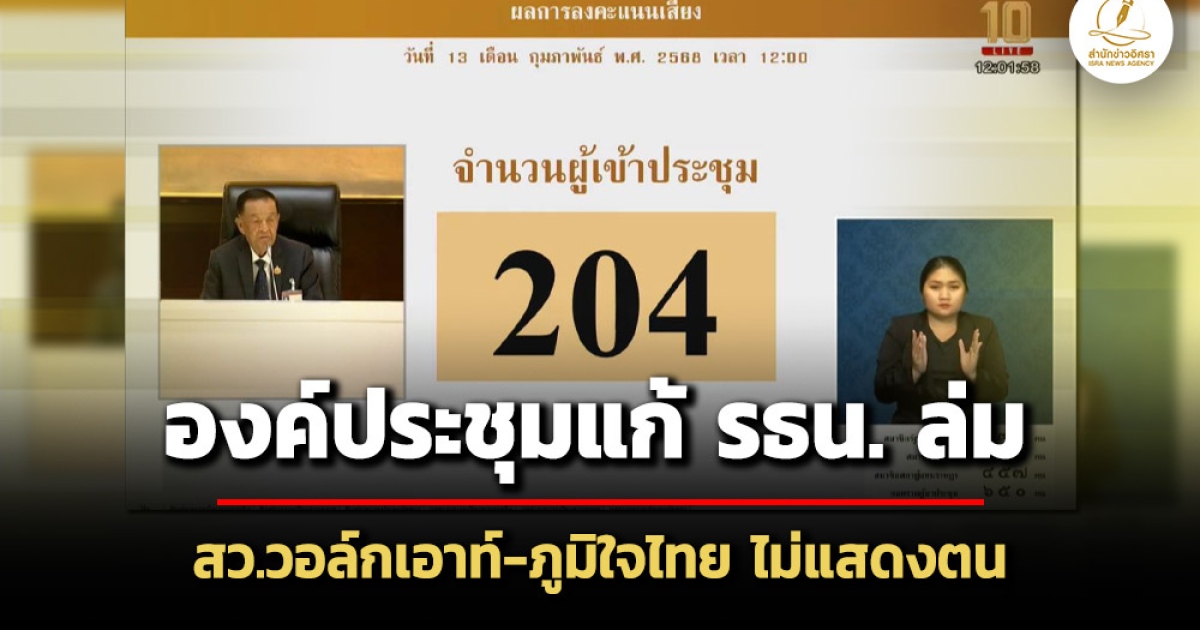 ขณะที่ผลการเสียบบัตรแสดงตนเพื่อนับองค์ประชุม โดยมีผู้เสียบบัตรแสงตนเป็นองค์ประชุม 204 คน ประกอบด้วย
