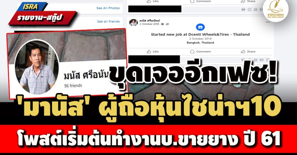 "...สำนักข่าวอิศรา ตรวจสอบพบข้อมูลใหม่ว่า มีบุคคลใช้ชื่อเฟซบุ๊กว่า "มนัส ศรีอนันต์" รูปภาพเจ้าของเฟซบุ๊กดังกล่าว หน้าตาคล้ายกับนายมานัส ศรีอนันต์ ในเอกสารการตรวจสอบของกรมสอบสวนคดีพิเศษ (ดีเอสไอ) ข้อมูลในเฟซบุ๊กชื่อ "มนัส ศรีอนันต์" ระบุว่า เริ่มต้นเป็นลูกจ้างให้กับ Dcenti Wheels&Tires - Thailand ตั้งแต่วันที่ 2 ต.ค.2561 มีภูมิลำเนาอยู่ที่ จ.เพชรบูรณ์ และเป็นเพื่อนในเฟซบุ๊กกับนายประจวบ ศิริเขตร ผู้ถือหุ้นอีกรายหนึ่ง..."