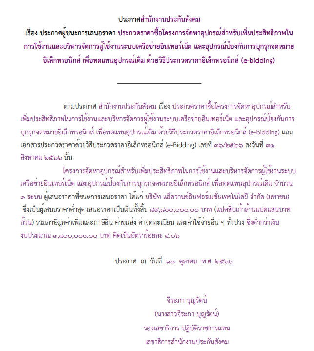 ล่าสุด สำนักข่าวอิศรา ตรวจสอบฐานข้อมูลจัดซื้อจัดจ้างของสำนักงานประกันสังคม ในส่วนที่เกี่ยวข้องกับโครงการด้านไอที พบว่า ในช่วงปี 2566-2567 มีการจัดซื้อจัดจ้างจำนวน 2 โครงการ คือ 1. โครงการจัดหาอุปกรณ์สำหรับเพิ่มประสิทธิภาพในการใช้งานและบริหารจัดการผู้ใช้งานระบบเครือข่ายอินเทอร์เน็ต และอุปกรณ์ป้องกันการบุกรุกจดหมายอิเล็กทรอนิกส์ เพื่อทดแทนอุปกรณ์เดิม ด้วยวิธีประกวดราคาอิเล็กทรอนิกส์ (e-bidding) วงเงินตามสัญญาจ้าง 89,800,000 บาท และ 2. งานประกวดราคาซื้อโครงการจัดหาเครื่องคอมพิวเตอร์แม่ข่ายเพื่อทดแทนและรองรับระบบสารสนเทศเพิ่มเติม ด้วยวิธีประกวดราคาอิเล็กทรอนิกส์ (e-bidding) วงเงินตามสัญญาจ้าง 158,280,000 บาท