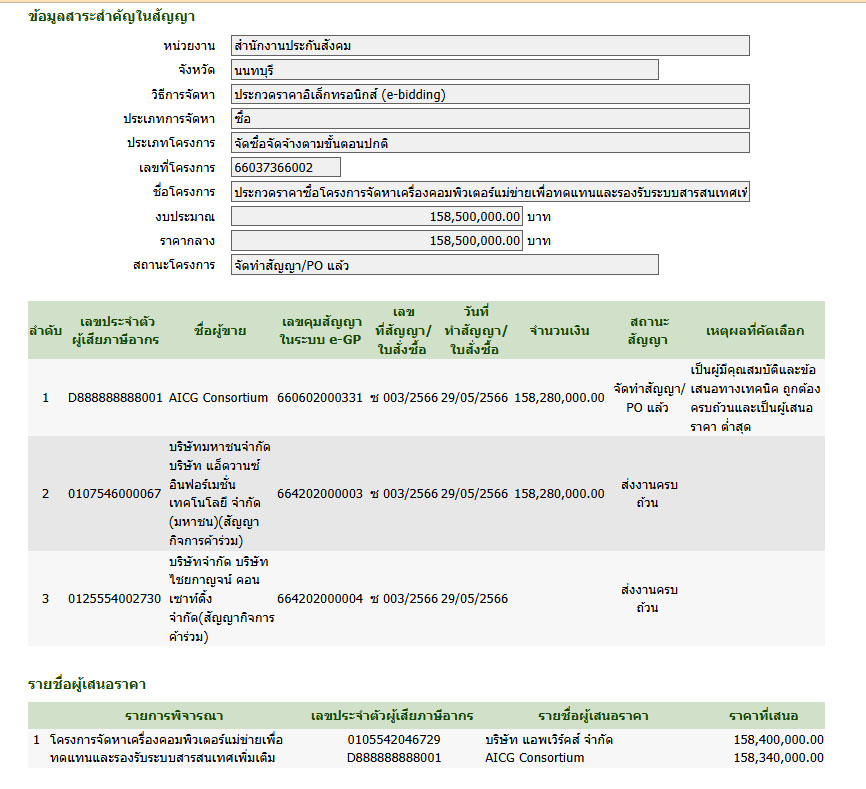 รวมวงเงินทั้ง 2 โครงการอยู่ที่ 248,080,000 บาท ปรากฏชื่อบริษัท แอ็ดวานซ์อินฟอร์เมชั่นเทคโนโลยี จำกัด (มหาชน) ได้รับงานว่าจ้างไปทั้ง 2 โครงการ โดยในส่วนโครงการประกวดราคาซื้อโครงการจัดหาเครื่องคอมพิวเตอร์แม่ข่ายเพื่อทดแทนและรองรับระบบสารสนเทศเพิ่มเติม ได้รับงานในนามกลุ่มกิจการร่วมค้า AICG Consortium ประกอบด้วยบริษัท แอ็ดวานซ์อินฟอร์เมชั่น เทคโนโลยี จำกัด (มหาชน) และบริษัท ไชยกาญจน์ คอนเซาท์ติ้ง จำกัด