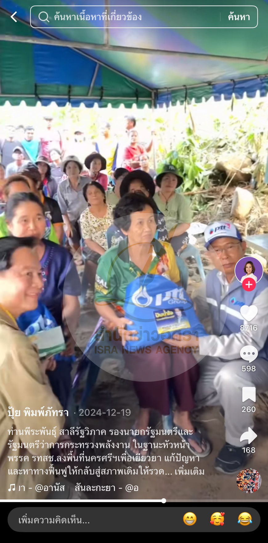 โชว์หลักฐาน 'พีระพันธุ์ สาลีรัฐวิภาค' แจกถุงยังชีพ ปตท. ติดสติกเกอร์ รูป-ชื่อ ตัวเองข้างถุง ก่อนป.ป.ช.ไต่สวนคดีจริยธรรม เรียกรับทราบข้อกล่าวหา 15 พ.ค.นี้ เผยคลิปเหตุการณ์เคยถูกโพสต์ไว้ใน tiktok 'พิมพ์ภัทรา วิชัยกุล' อดีตรมว.อุตสาหกรรม ช่วงปลายปี 67 - ด้านรองนายกฯ ให้สัมภาษณ์สื่อรู้เรื่องแล้ว เพราะกลั่นแกล้งมาตั้งนาน - เรียกมาก็พร้อมไปชี้แจง