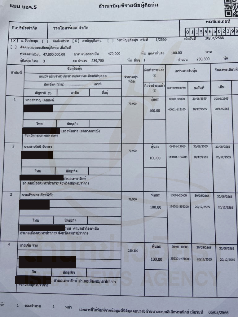 1.บริษัท วาลโออาร์เอส จำกัด จดทะเบียนวันที่ 1 กันยายน 2565 ทุน 4 ล้านบาท ประกอบการ ให้บริการซ่อมแอร์ เครื่องทำความเย็น ที่ตั้งเลขที่ 208 หมู่ที่ 8 ต.เทพารักษ์ อ.เมืองสมุทรปราการ จ.สมุทรปราการ นางวรรณภา หนันดูล อายุ 37 ปี แจ้งที่อยู่ หมู่ 2 ต.สระบัว อ.ปทุมรัตน์ จ.ร้อยเอ็ด เป็นกรรมการก่อตั้ง นายสำราญ เดชสงค์ ถือหุ้นใหญ่ และผู้ถือหุ้นอีก 2 คน รวมเป็น 3 คน