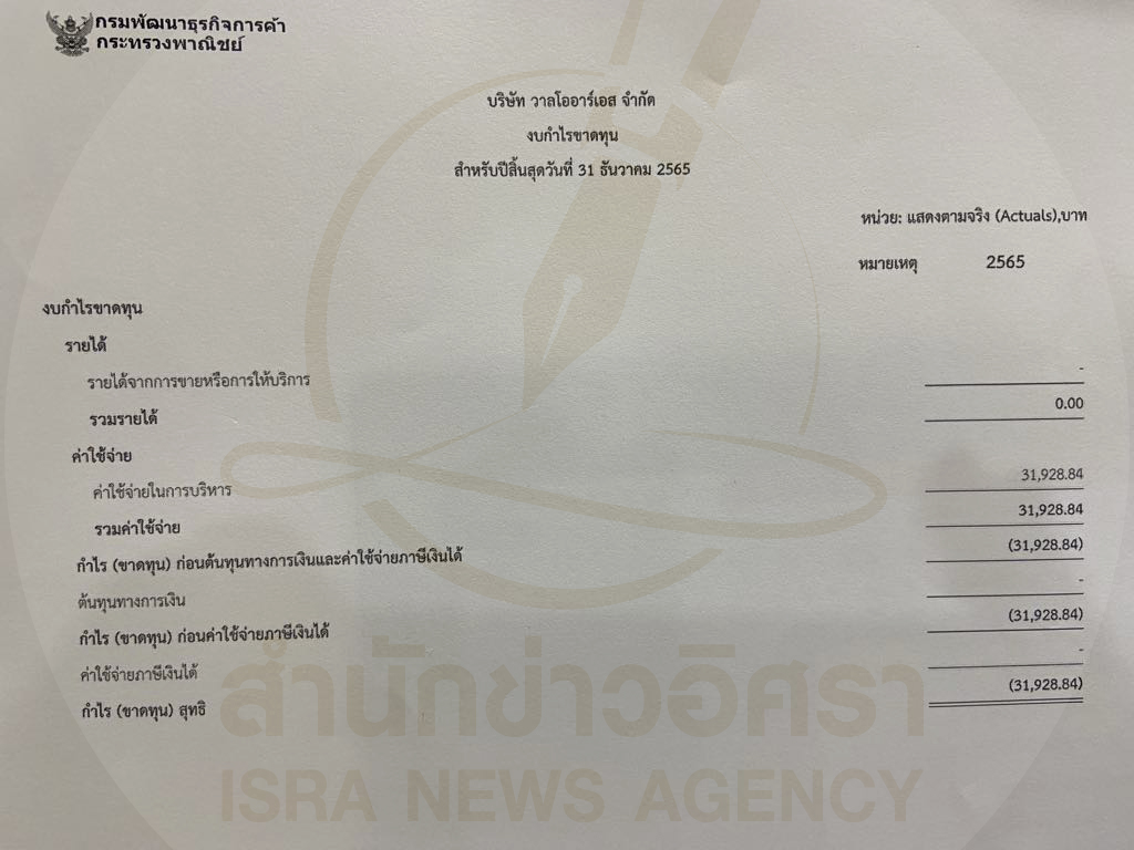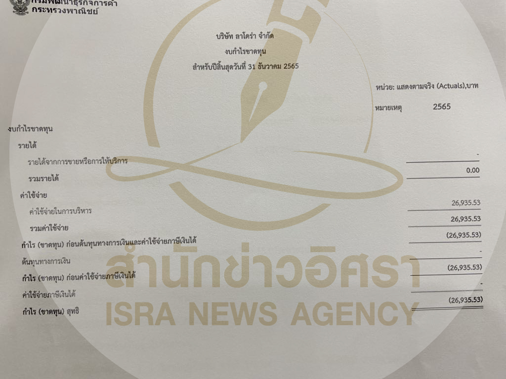 ข้อมูลงบการเงิน วันที่ 5 พ.ค.2566 นำส่งงบการเงินรอบปีบัญชีสิ้นสุด 31 ธ.ค.2565 งบกำไรขาดทุน ไม่มีรายได้ ค่าใช้จ่าย 31,928.84 บาท ขาดทุนสุทธิ 31,928.84 บาท งบดุล สินทรัพย์ 46,975,281.16 บาท (ที่ดิน อาคารและอุปกรณ์ สุทธิ 46,175,281.16 บาท ) หนี้สิน 7,210 บาท ขาดทุนสะสม 31,928.84 บาท