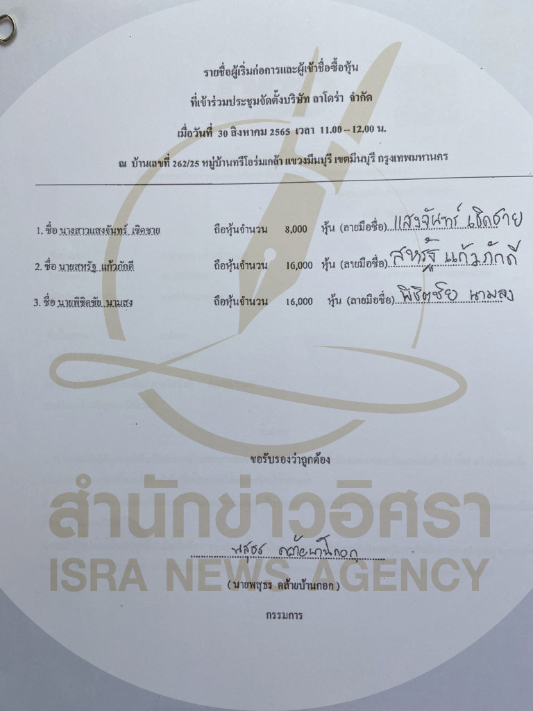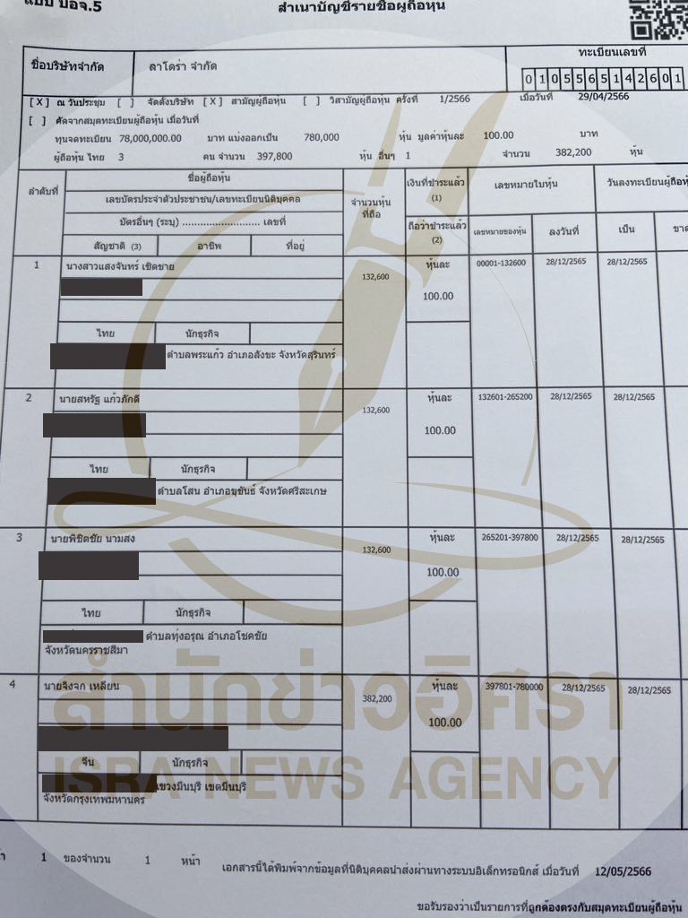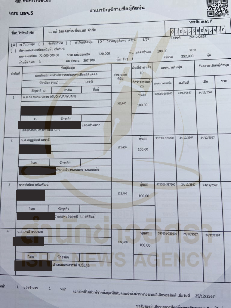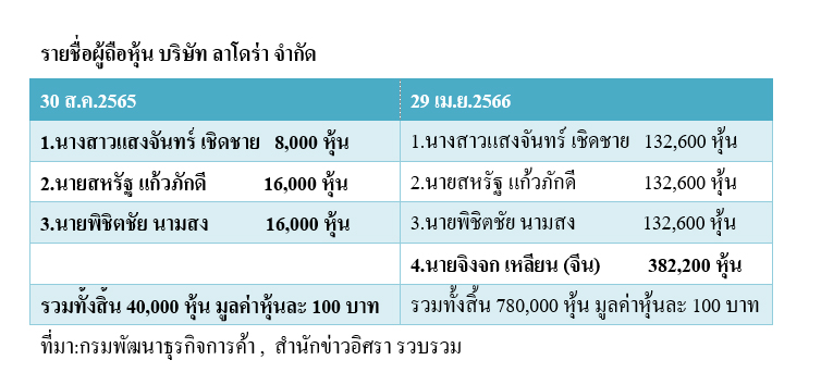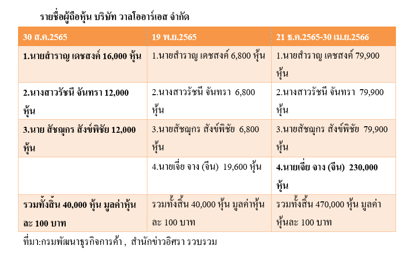 ข้อมูลบัญชีรายชื่อผู้ถือหุ้น (บอจ.5) วันที่ 16 พ.ย.2566 หลังเพิ่มทุน น.ส.กัว หยวน ถือหุ้นใหญ่ 352,800 หุ้น จากจำนวนทั้งสิ้น 720,000 หุ้น มูลค่าหุ้นละ 100 บาท และถือหุ้นใหญ่จนถึงล่าสุด ผู้ถือหุ้นคนไทย 3 คนถือคนละ 122,400 หุ้น (คนละ 12,240,000 บาท) (ดูตารางและเอกสาร)