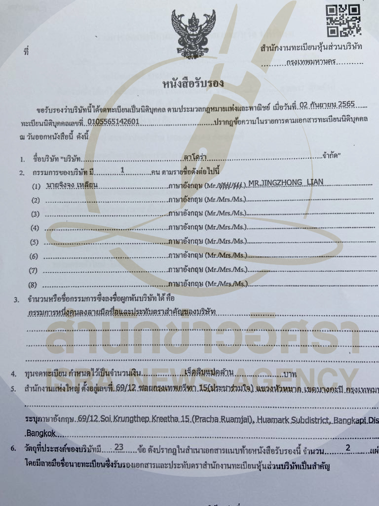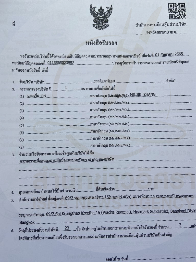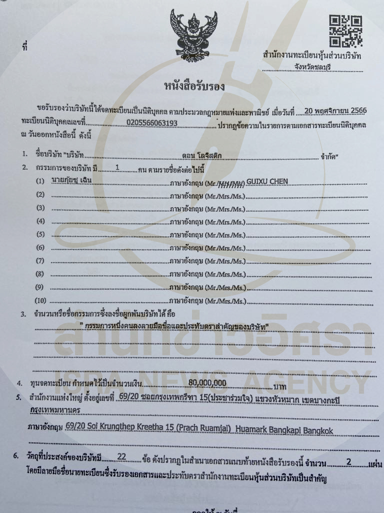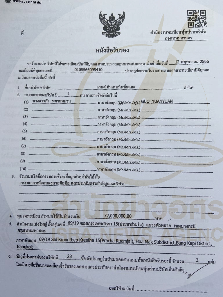 27 มิ.ย.2566 จดทะเบียนเพิ่มทุนเป็น 72 ล้านบาท ต่อมา วันที่ 6 ก.ค.2566 จดทะเบียนแก้ไขสำนักงานที่ตั้ง เลขที่ 69/19 ซอยกรุงเทพกรีฑา 15 (ประชาร่วมใจ) แขวงหัวหมาก เขตบางกะปิ จังหวัดกรุงเทพมหานคร วันที่ 21 พ.ย.2566 จดทะเบียนเปลี่ยนแปลงกรรมการ นางสาวกัว หยวนหยวน (Miss GUO YUANYUAN) อายุ 32 ปี สัญชาติจีน เข้าเป็นกรรมการ (นายจงพิสุทธิ์ อนจันทร์ ออก)
