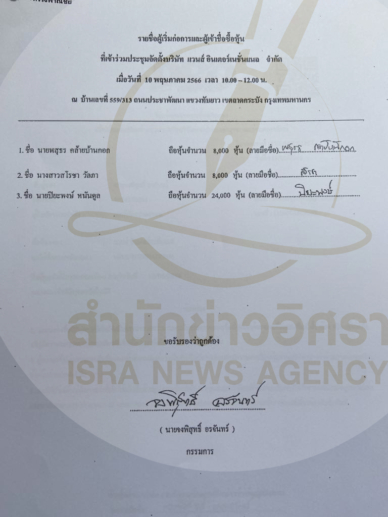 3.บริษัท แวนส์ อินเตอร์เนชั่นแนล จำกัด จดทะเบียนวันที่ 12 พฤษภาคม 2566 ทุน 4 ล้านบาท ประกอบกิจการขายปลีกผักและผลไม้ ที่ตั้งเลขที่ 559/313 ถ.ประชาพัฒนา แขวงทับยาว เขตลาดกระบัง กรุงเทพฯ นายจงพิสุทธิ์ อนจันทร์ อายุ 31 ปี แจ้งที่อยู่ หมู่ 7 ต.เทพารักษ์ อ.เมืองสมุทรปราการ จ.สมุทรปราการ เป็นกรรมการ นายปิยะพงษ์ หนันดูล ถือหุ้นใหญ่ 24,000 หุ้น ( อายุ 33 ปีแจ้งที่อยู่ หมู่ที่ 3 ต.สระบัว อ.ปทุมรัตน์ จ.ร้อยเอ็ด ) นายพสุธร คล้ายบ้านกอก (กรรมการก่อตั้ง บริษัท ลาโดร่า จำกัด) และผู้ถือหุ้นชาวไทยอีก 1 คน รวมถือหุ้น รวมเป็น 3 คน