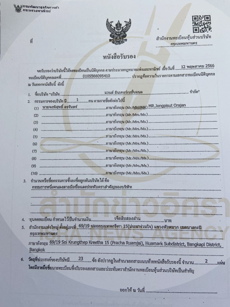 11 มิ.ย.2567 จดทะเบียนเปลี่ยนแปลงเปลี่ยนแปลง นายรุ่นซัน (Mr.Sun Rui) อายุ 34 ปี สัญชาติกัมพูชา เข้าเป็นกรรมการ (นางชนิสรา บุญทศ ออก) และแจ้งสำนักงานที่ตั้งเลขที่ 69/14 ซอยกรุงเทพกรีฑา 15 (ประชาร่วมใจ) แขวงหัวหมาก เขตบางกะปิ กรุงเทพมหานคร (หมู่บ้านนาราสิริ กรุงเทพกรีฑา)
