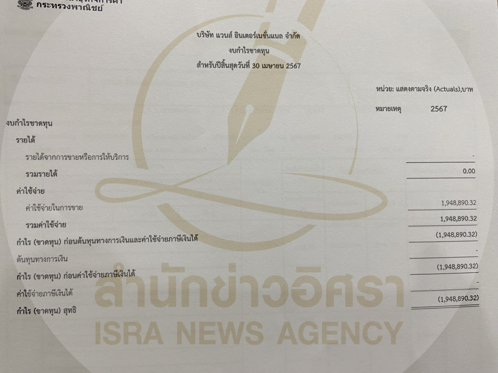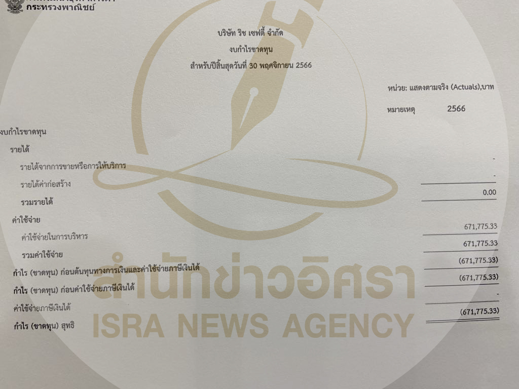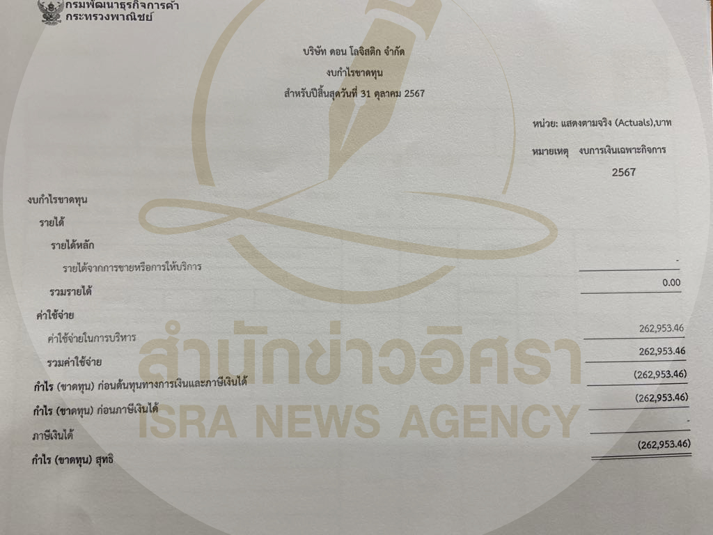 ข้อมูลงบการเงิน วันที่ 31 มี.ค.2568 นำส่งงบการเงินรอบปีบัญชีสิ้นสุด 31 ต.ค.2567 งบกำไรขาดทุน ไม่มีรายได้ ค่าใช้จ่าย 262,953.46 บาท ขาดทุนสุทธิ 262,953.46 บาท งบดุล สินทรัพย์รวม 79,741,546.54 บาท หนี้สิน 4,500 บาท ขาดทุนสะสม 262,953.46 บาท