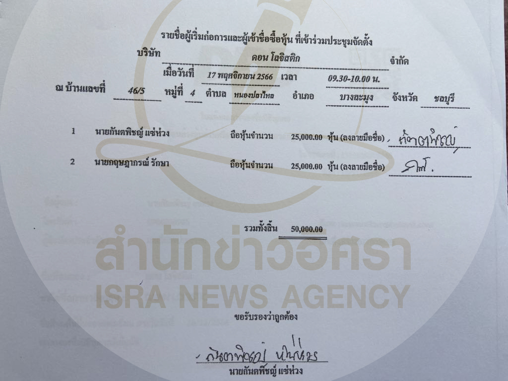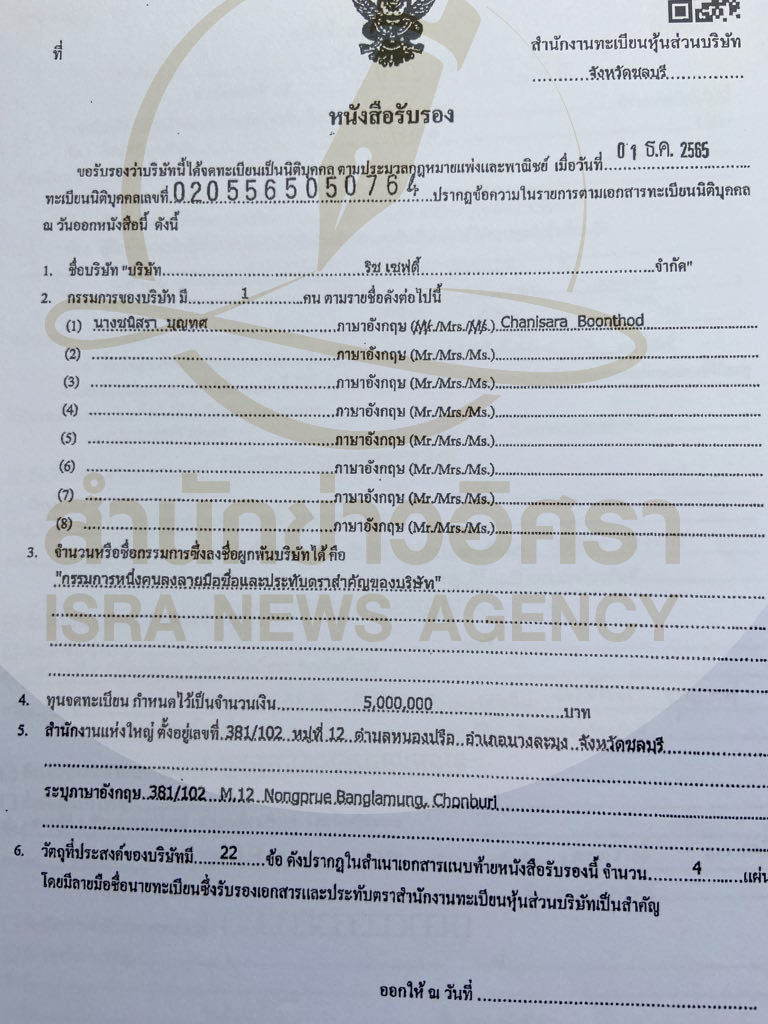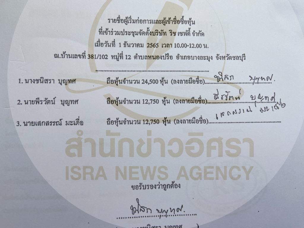 4.บริษัท ริช เซฟตี้ จำกัด จดทะเบียนวันที่ 1 ธันวาคม 2565 ทุน 5 ล้านบาท การซื้อและการขายอสังหาริมทรัพย์ที่เป็นของตนเองที่ไม่ใช่ เพื่อเป็นที่พักอาศัย ที่ตั้งเลขที่ 381/102 หมู่ที่ 12 ต.หนองปรือ อ.บางละมุง จ.ชลบุรี นางชนิสรา บุญทศ อายุ 25 ปี ที่อยู่หมู่ 6 ต.โคกแฝด เขตหนองจอก กรุงเทพฯ เป็นกรรมการก่อตั้งและถือหุ้นใหญ่ และ ผู้ถือหุ้นคนไทยอีก 2 คน