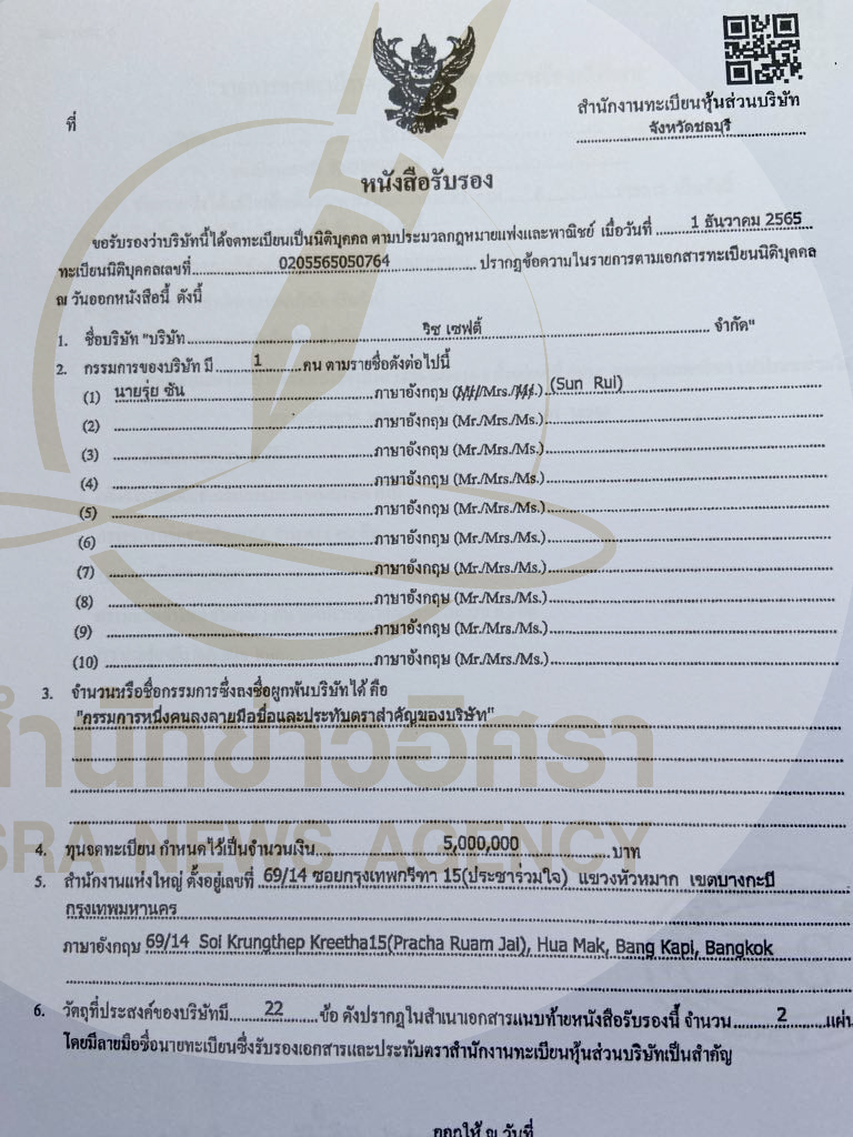 วันที่ 20 ธ.ค.2565 จดทะเบียนเพิ่มทุน เป็น 47 ล้านบาท และนายเจี่ย จาง อายุ 60 ปี สัญชาติจีน เข้ามาเป็นมาเป็นกรรมการเพิ่มอีก 1 คน