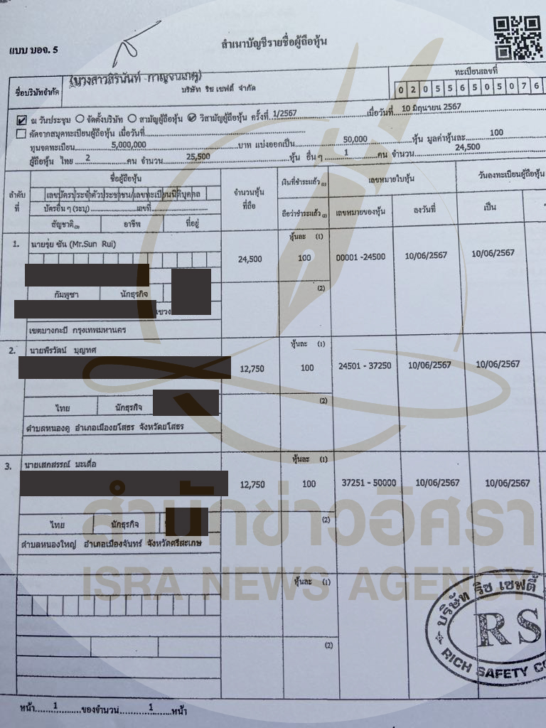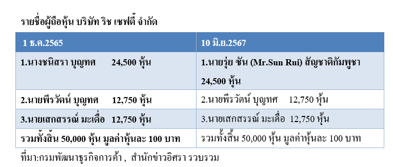 ข้อมูลบัญชีรายชื่อผู้ถือหุ้น (บอจ.5) วันที่ 10 มิ.ย.2567 นายรุ่ย ซัน ถือหุ้นใหญ่ 24,500 หุ้น (รับโอนจากนางชนิสรา บุญทศ) ผู้ถือหุ้นชาวไทยอีก 2 คนไม่เปลี่ยนแปลง (ดูตารางและเอกสาร)