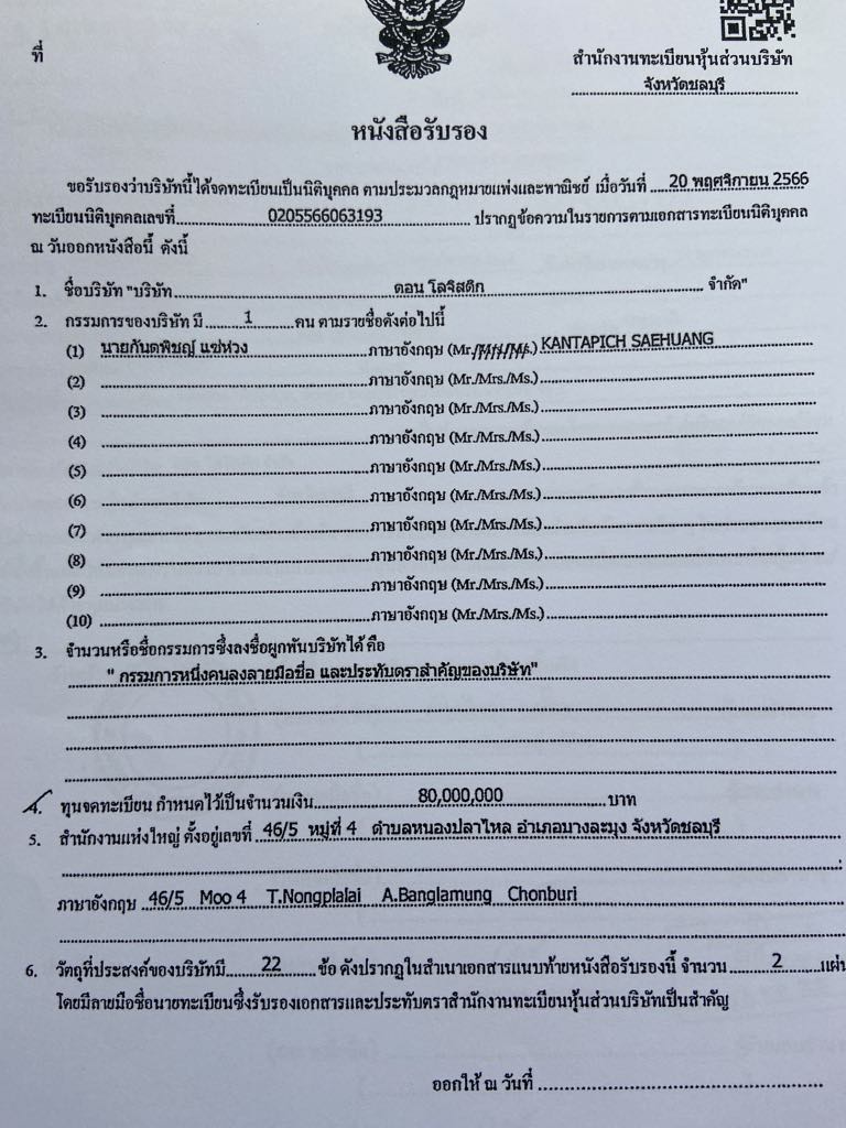 วันที่ 20 ธ.ค.2566 (หลังก่อตั้ง 1 เดือน) จดทะเบียนเพิ่มทุนเป็น 80 ล้านบาท