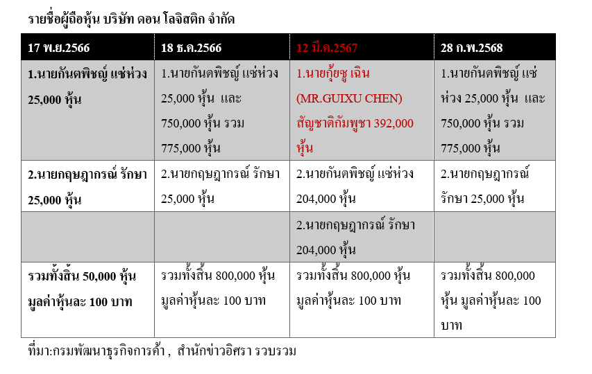 กระทั่งล่าสุด 28 ก.พ.2568 นายกันตพิชญ์ ถือหุ้นใหญ่อีกครั้ง 775,000 หุ้น (ชื่อนายกุ้ยซู เฉิน หายไป) (ดูตารางและเอกสาร)