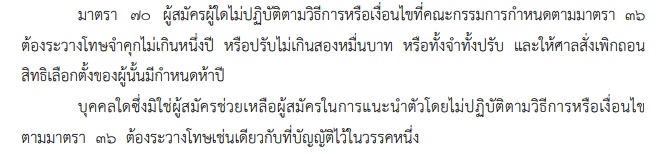 ผู้สมัครผู้ใดไม่ปฏิบัติตามวิธีการหรือเงื่อนไขที่คณะกรรมการกําหนดตามมาตรา 36 ต้องระวางโทษจําคุกไม่เกินหนึ่งปี หรือปรับไม่เกินสองหมื่นบาท หรือทั้งจําทั้งปรับ และให้ศาลสั่งเพิกถอน สิทธิเลือกตั้งของผู้นั้นมีกําหนดห้าปี