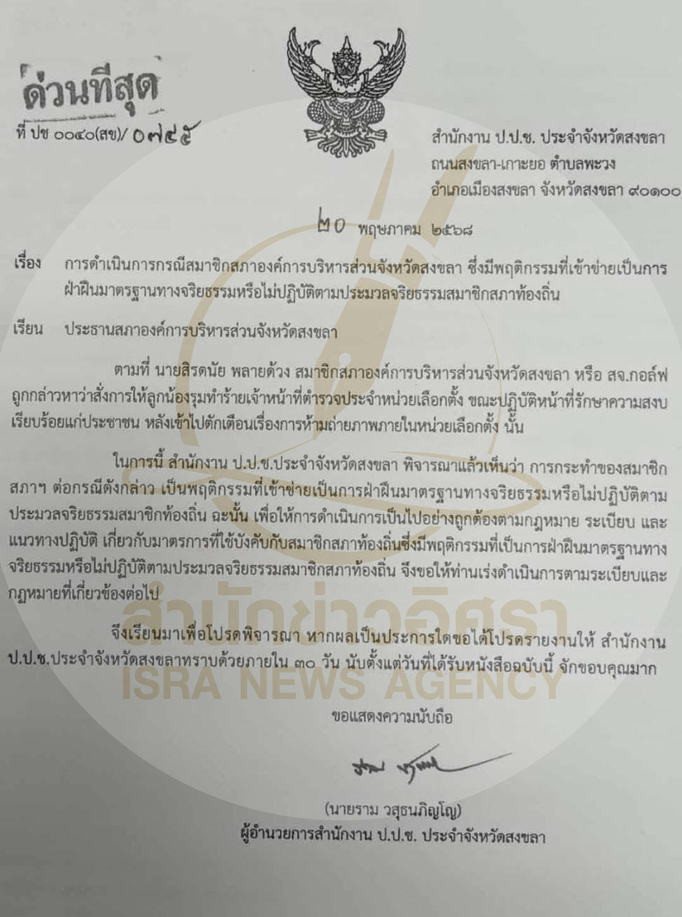 ป.ป.ช.สงขลา ชี้พฤติการณ์ 'สิรตนัย พลายด้วง' หรือ สจ.กอล์ฟ ถูกกล่าวหาสั่งการลูกน้องรุมทำร้ายตำรวจ หลังโดนตักเตือนห้ามถ่ายภาพในหน่วยเลือกตั้ง เข้าข่ายฝ่าฝืนมาตรฐานทางจริยธรรมสมาชิกท้องถิ่น ทำหนังสือแจ้งประธานสภา อบจ.ดำเนินการตามระเบียบ-กฎหมายที่เกี่ยวข้อง รายงานผลให้ทราบภายใน 30 วัน