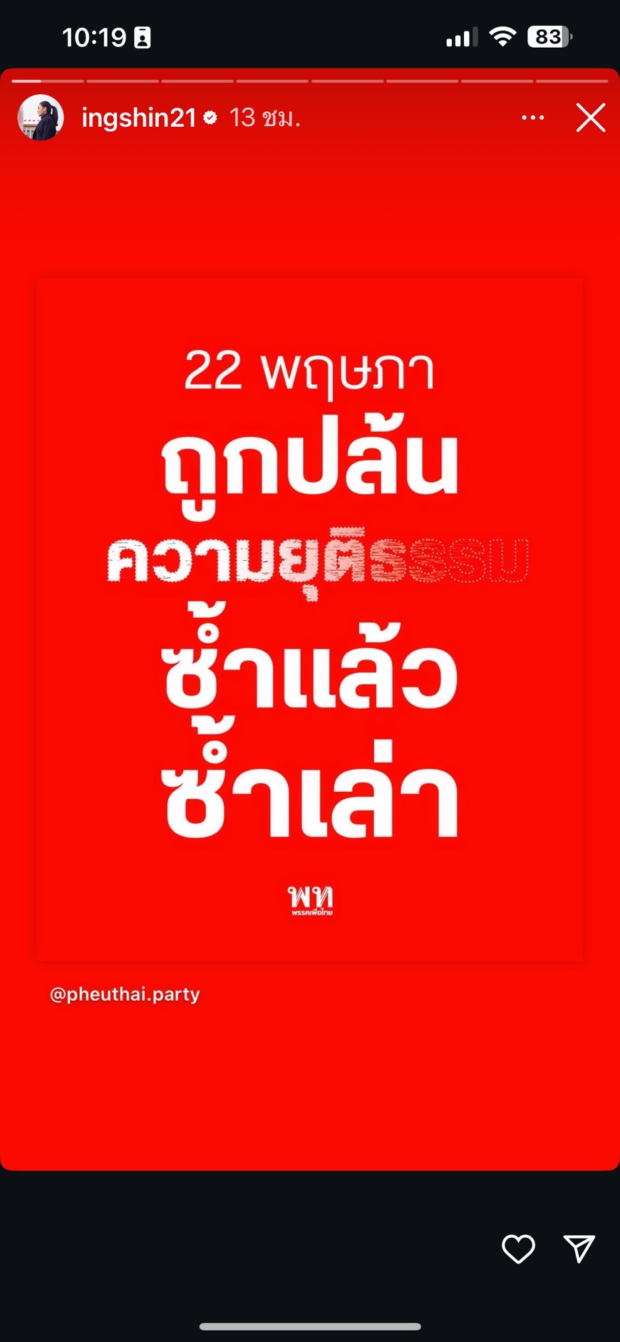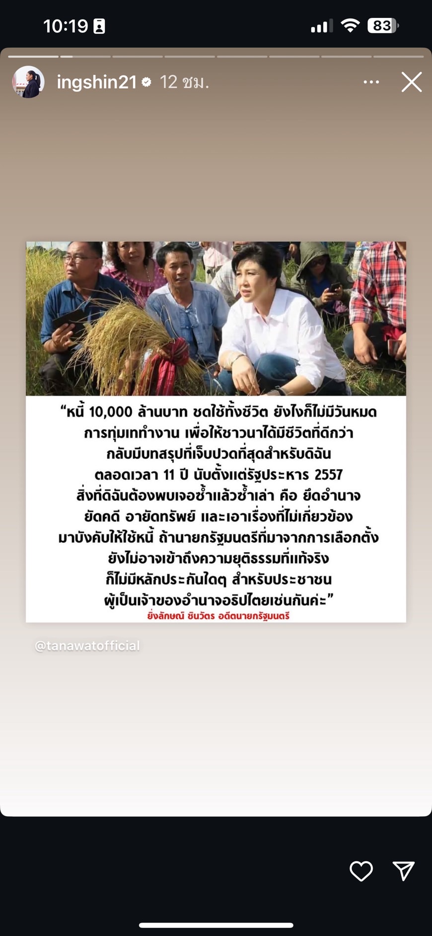 นางสาวแพทองธาร ชินวัตร นายกรัฐมนตรี ได้โพสต์สตอรี่ใน Instagram ส่วนตัวที่ชื่อว่า ingshin21 ให้กำลังใจ นางสาวยิ่งลักษณ์ ชินวัตร ผู้เป็น 'อา' หลายภาพติดต่อกัน