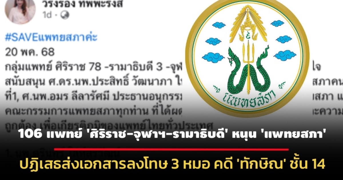 106 แพทย์ 'ศิริราช-จุฬาฯ-รามาธิบดี' หนุน 'แพทยสภา' กรณีปฏิเสธส่งเอกสารลงโทษ 3 หมอ คดี 'ทักษิณ ชินวัตร' ชั้น 14
