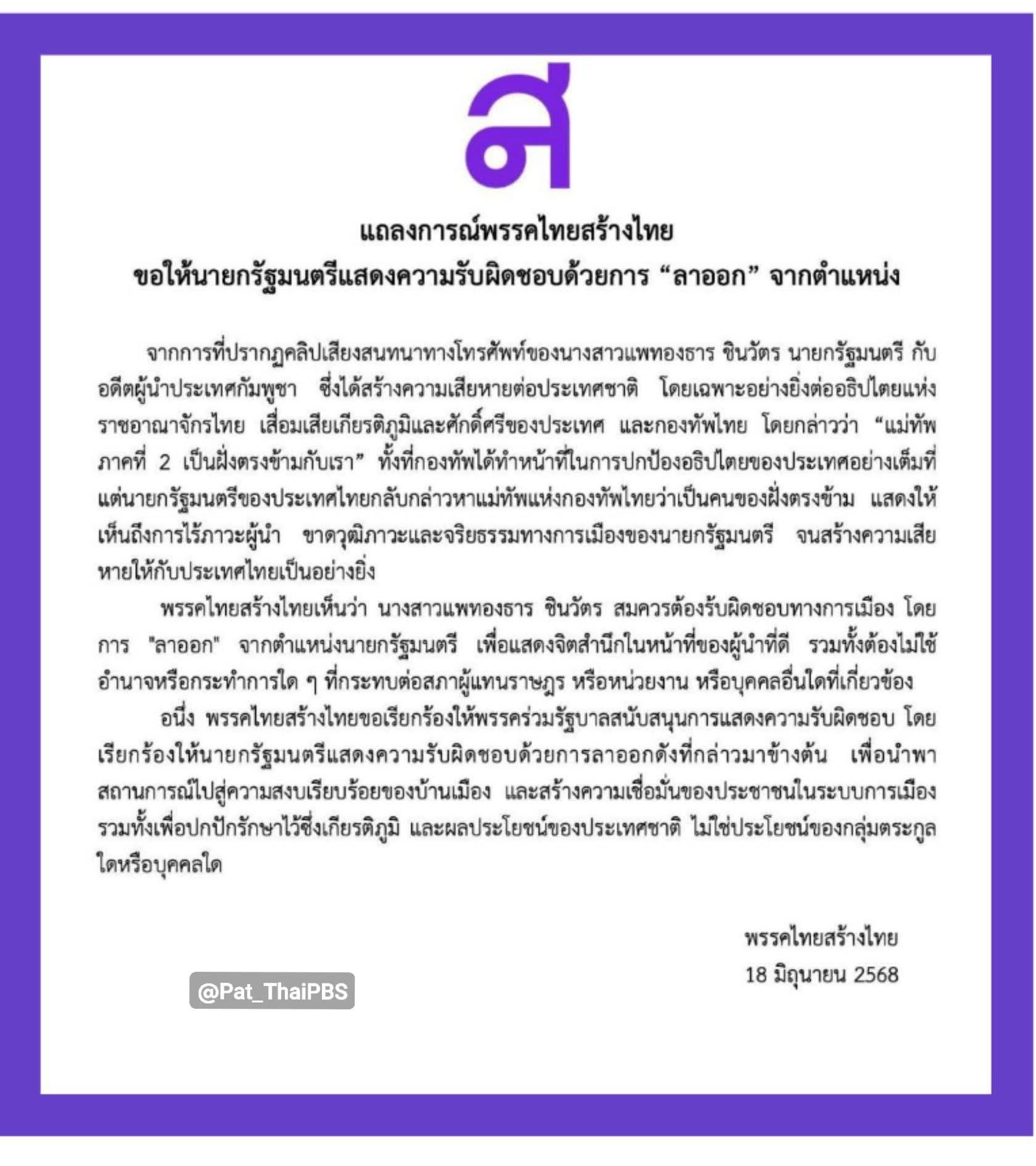 เช่นเดียวกับ พรรคไทยสร้างไทย ที่ออกแถลงการณ์เรียกร้องให้ น.ส.แพทองธาร ชินวัตร แสดงความรับผิดชอบลาออกจากตำแหน่งนายกรัฐมนตรี เช่นกัน
