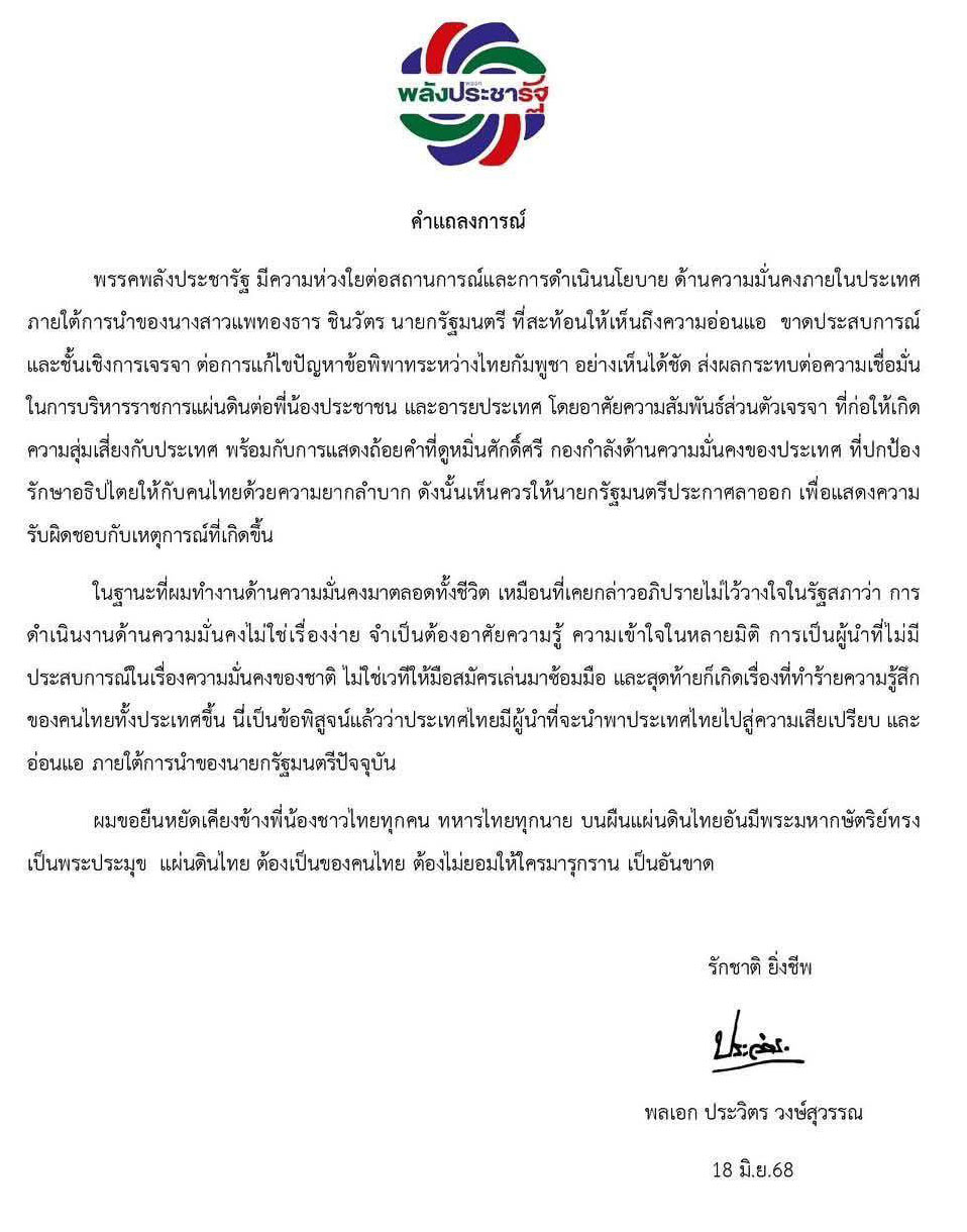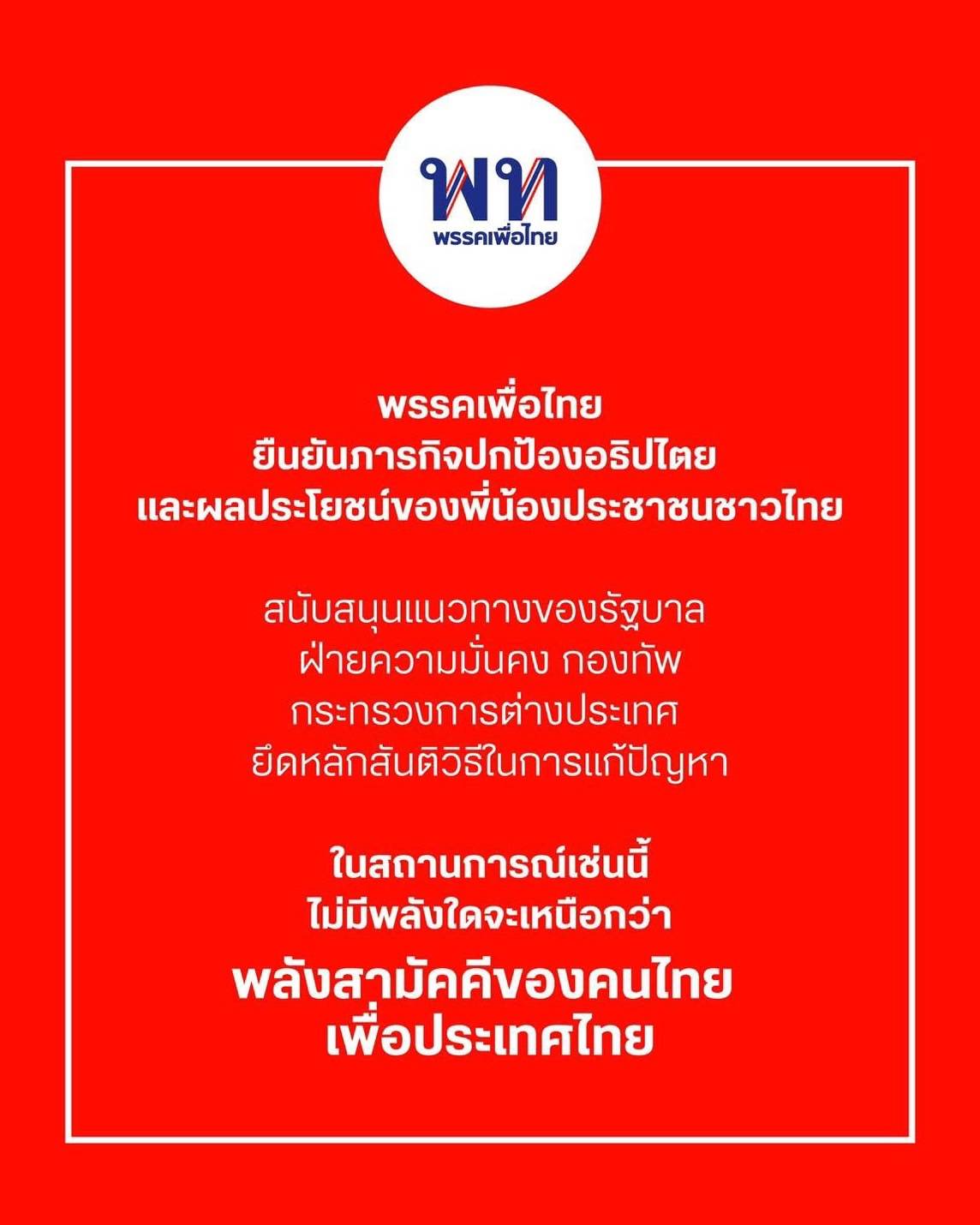 อย่างไรก็ดี พรรคเพื่อไทย ได้เผยแพร่ประกาศยืนยันภารกิจปกป้องอธิปไตย สนับสนุนแนวทางรัฐบาล ฝ่ายความมั่งคง กองทัพ กระทรวงการต่างประเทศ ยึดหลักสันติวิธีในการแก้ไขปัญหาต่อไป