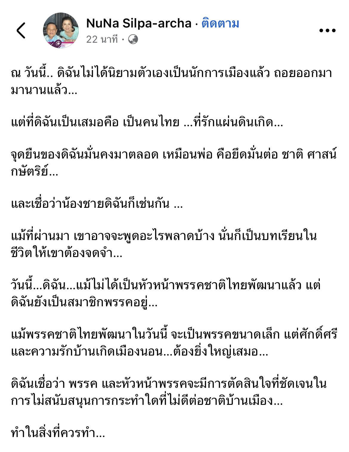 วันนี้…ดิฉัน…แม้ไม่ได้เป็นหัวหน้าพรรคชาติไทยพัฒนาแล้ว แต่ดิฉันยังเป็นสมาชิกพรรคอยู่