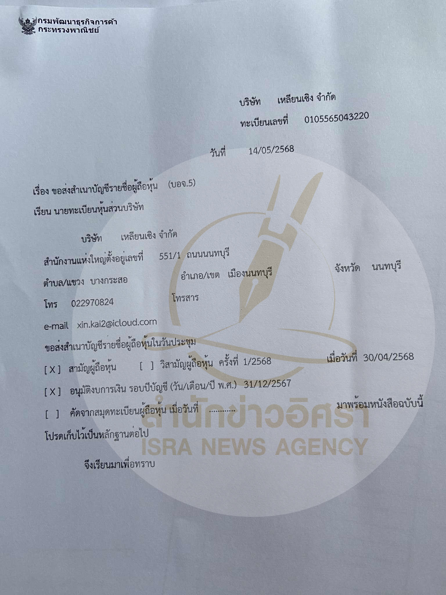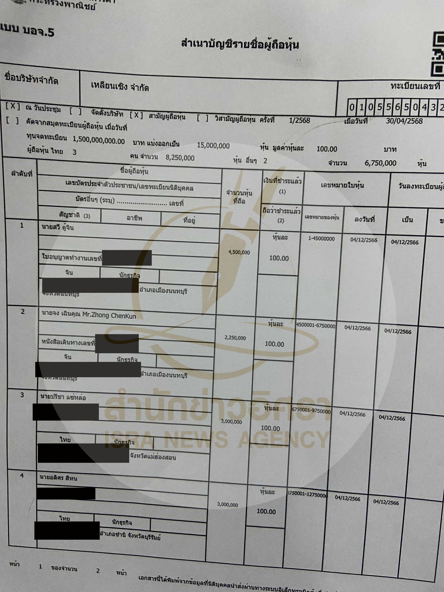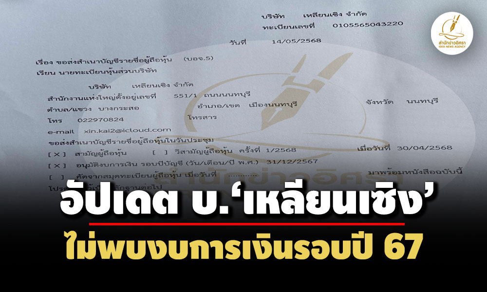 • บัญชีผู้ถือหุ้นล่าสุด บ.ทุนจีน‘เหลียนเซิง’ ยังมีชื่อ 3 คนไทย 825 ล. –ไม่พบงบฯรอบปี 67