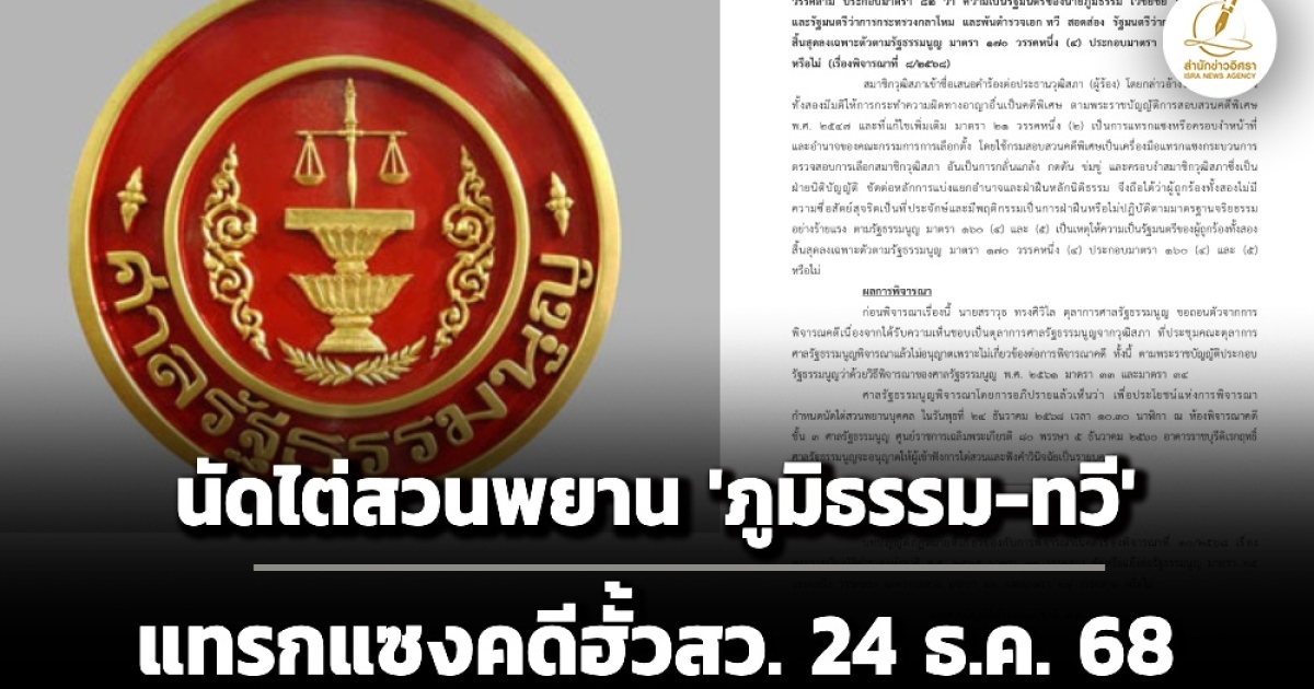 ศาลรัฐธรรมนูญพิจารณาโดยการอภิปรายแล้วเห็นว่า เพื่อประโยชน์แห่งการพิจารณากำหนดนัดไต่สวนพยานบุคคล ในวันพุธที่ 24 ธันวาคม 2568 เวลา 10.30 นาฬิกา ณ ห้องพิจารณาคดีชั้น 3 ศาลรัฐธรรมนูญ ศูนย์ราชการเฉลิมพระเกียรติ 80 พรรษา 5 ธันวาคม 2560 อาคารราชบุรีดิเรกฤทธิ์ ศาลรัฐธรรมนูญจะอนุญาตให้ผู้เข้าฟังการไต่สวนและฟังคำวินิจฉัยเป็นรายบุคคล