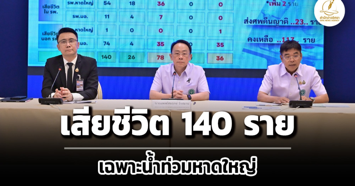 สธ.เผยตัวเขผู้เสียชีวิตจากน้ำท่วมหาดใหญ่เพิ่มเป็น 140 ราย ส่วนอีก 7 จังหวัด ให้ติดตามตรวจสอบ-รายงานเข้ามาในระบบต่อไป เปิด รพ.สนามเป็น 11 แห่ง ส่งทีมหมอเดินเท้าออกตามชุมชนครอบคลุมพื้นที่กว่า 75% คัดกรองสุขภาพจิตไปแล้วกว่า 3,800 ราย