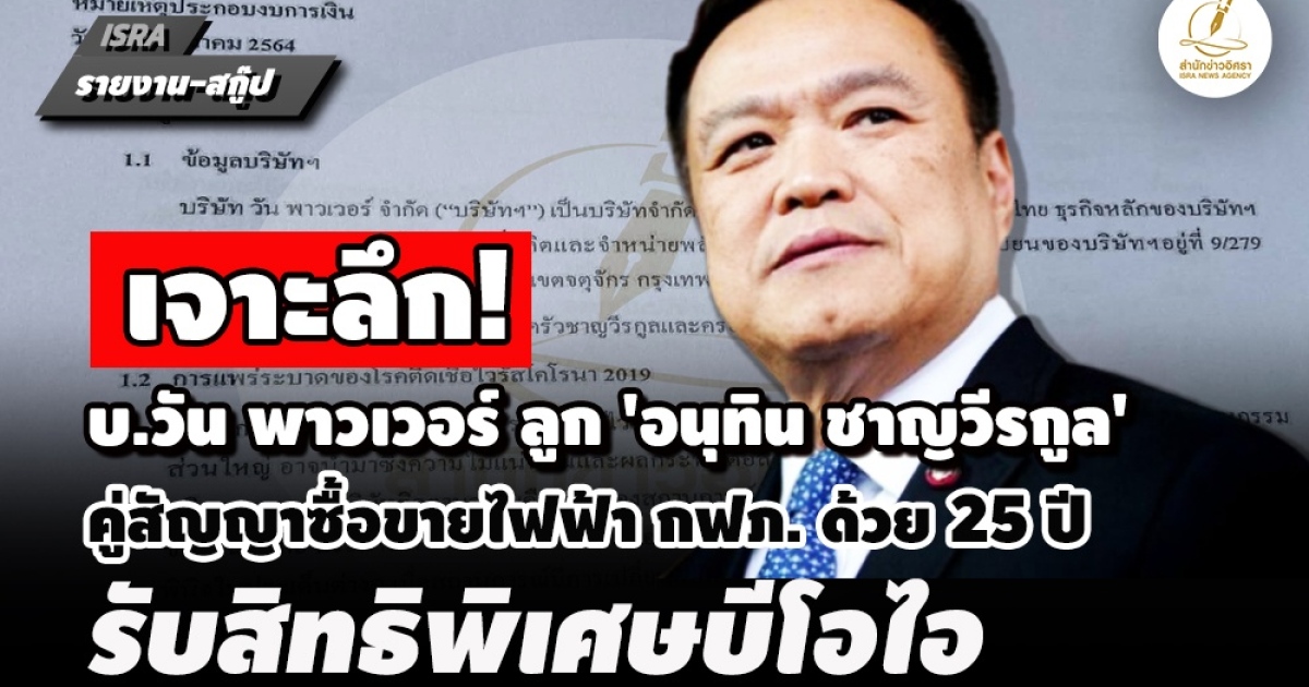 • เจาะ บ.วัน พาวเวอร์ ลูก‘อนุทิน ชาญวีรกูล’ – คู่สัญญาซื้อขายไฟฟ้า กฟภ.ด้วย 25 ปี