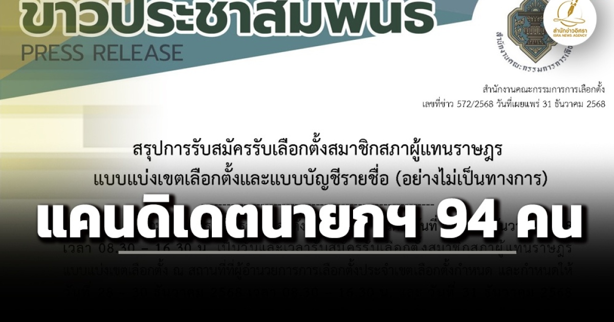สำนักข่าวอิศรา (www.isranews.org) รายงานว่า วันที่ 31 ธันวาคม 2568 สำนักงานคณะกรรมการการเลือกตั้ง (กกต.) สรุปการรับสมัครรับเลือกตั้งสมาชิกสภาผู้แทนราษฎร (สส.) แบบแบ่งเขตเลือกตั้ง และ สส.แบบบัญชีรายชื่อ (ปาร์ตี้ลิสต์) อย่างไม่เป็นทางการ ภายหลังเปิดรับสมัครตั้งแต่วันที่ 27 – 31 ธ.ค.68 รวม 5 วัน โดยมีรายละเอียด ดังต่อไปนี้