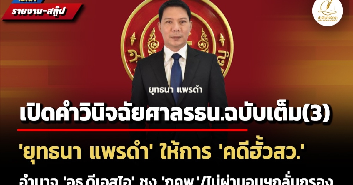 สำนักข่าวอิศรา (www.isranews.org) ได้นำคำวินิจฉัยฉบับเต็มตอนที่ 1 และตอนที่ 2 ไปแล้ว เนื่องจากคำวินิจฉัยมีจำนวน 65 หน้า จึงขอนำเสนอเฉพาะการพิจารณาและวินิจฉัยประเด็นหลักแห่งคดี ตอนนี้เป็นตอนที่สาม