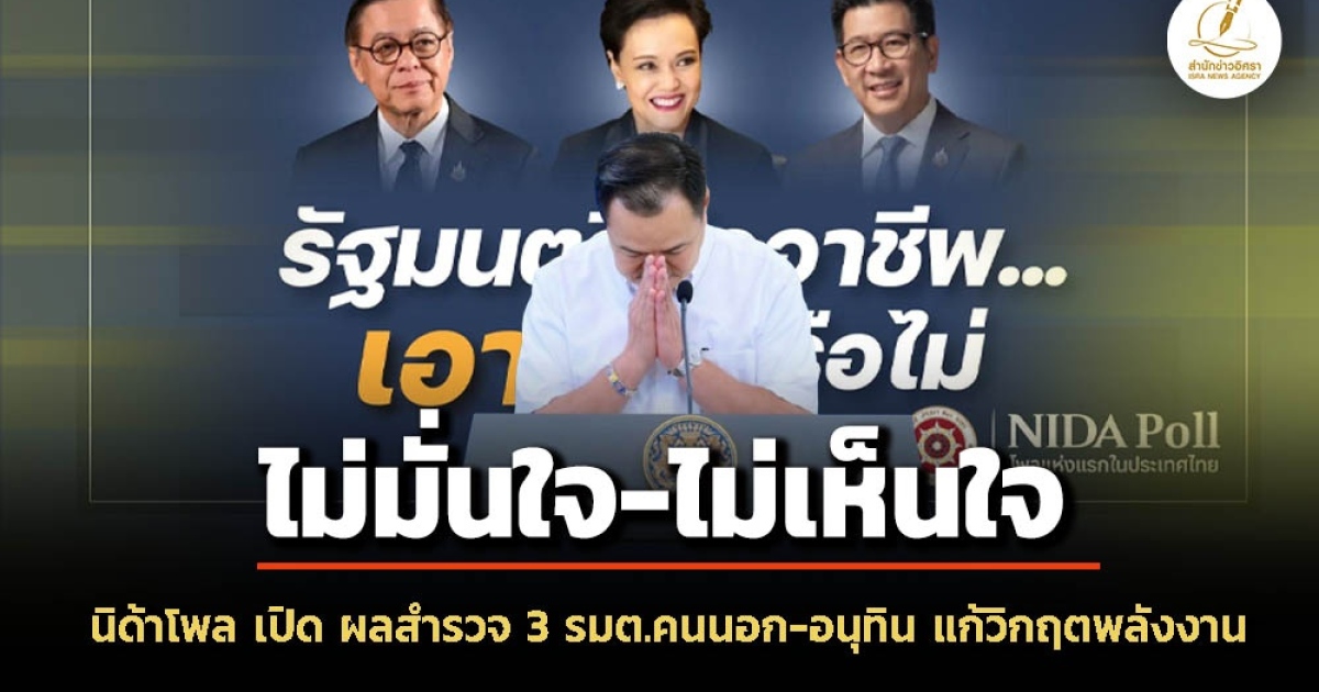 สำนักข่าวอิศรา (www.isranews.org) รายงานว่า วันที่ 5 เมษายน 2569 ศูนย์สำรวจความคิดเห็น 'นิด้าโพล' สถาบันบัณฑิตพัฒนบริหารศาสตร์ (นิด้า) เปิดเผยผลการสำรวจ เรื่อง 'รัฐมนตรีมืออาชีพ… เอาอยู่หรือไม่' ทำการสำรวจระหว่างวันที่ 31 มีนาคม – 1 เมษายน 2569 จากประชาชนที่มีอายุ 18 ปีขึ้นไป กระจายทุกภูมิภาค ระดับการศึกษา อาชีพ และรายได้ ทั่วประเทศ รวมจำนวนทั้งสิ้น 1,310 หน่วยตัวอย่าง เกี่ยวกับความคิดเห็นของประชาชนต่อความพยายามของรัฐบาลนายกรัฐมนตรีนายอนุทิน ชาญวีรกูล ในการแก้ไขวิกฤตพลังงานและเศรษฐกิจ การสำรวจอาศัยการสุ่มตัวอย่างโดยใช้ความน่าจะเป็นจากบัญชีรายชื่อฐานข้อมูลตัวอย่างหลัก (Master Sample) ของ “นิด้าโพล” สุ่มตัวอย่างแบบหลายขั้นตอน (Multi-stage Sampling) เก็บข้อมูลด้วยวิธีการสัมภาษณ์ทางโทรศัพท์ โดยกำหนดค่าความคลาดเคลื่อนไม่เกิน 0.05 ที่ระดับความเชื่อมั่น ร้อยละ 97.0 จากการสำรวจเมื่อถามถึงความมั่นใจของประชาชนต่อรัฐมนตรีคนนอก 3 ท่าน ในการนำพาประเทศผ่านวิกฤตพลังงานและเศรษฐกิจ พบว่า