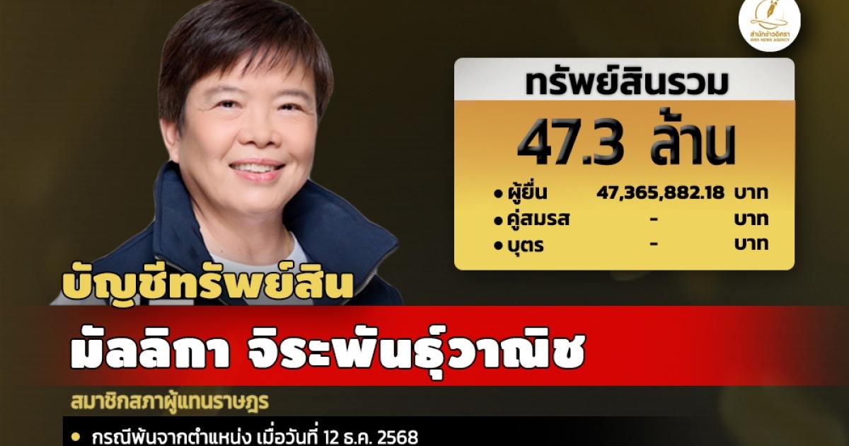 สำนักงานคณะกรรมการป้องกันและปราบปรามการทุจริตแห่งชาติ (ป.ป.ช.) ได้เปิดเผยบัญชีแสดงรายการทรัพย์สินและหนี้สินของ นางสาวมัลลิกา จิระพันธุ์วาณิช กรณีพ้นจากตำแหน่งสมาชิกสภาผู้แทนราษฎร (สส.) เมื่อวันที่ 12 ธันวาคม 2568