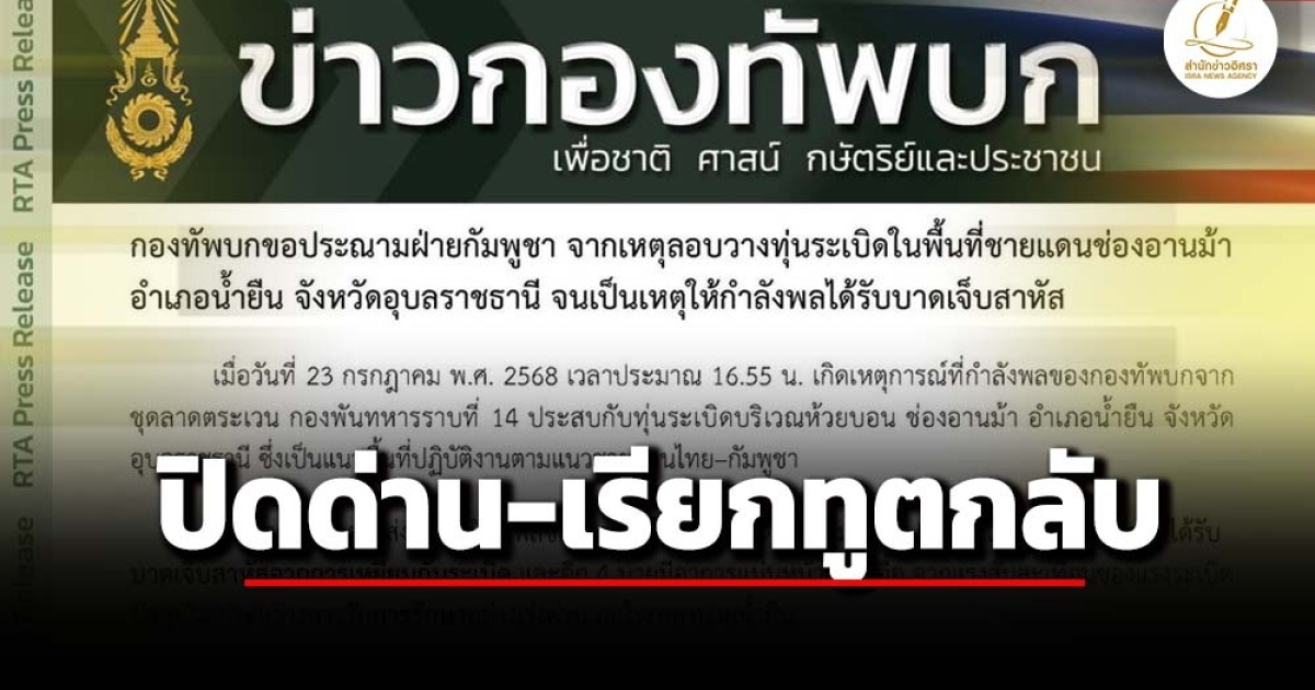 หน่วยลาดตระเวน ชุด ลว.พัน.ร.14 เหยียบกับระเบิดในพื้นที่ห้วยบอน ช่องอานม้า อ.น้ำยืน บาดเจ็บ 4 ราย - ขาขวาขาด 1 นาย - กองทัพบก ประณาม ไร้มนุษยธรรม เตรียมพร้อมปฏิบัติตามแผน ‘จักรพงษ์ภูวนาถ’ พล.อ.พนา แคล้วปลอดทุกข์ ผบ.ทบ. รุดที่เกิดเหตุ ภูมิธรรม เวชยชัย รองนายกฯ-รมว.มหาดไทย รักษาการนายกฯ ไฟเขียว กองทัพภาคที่ 2 ปิดด่านทั้งหมด เรียกทูตไทยประจำกัมพูชากลับ ลดระดับความสัมพันธ์ ส่งทูตกัมพูชากลับประเทศ
