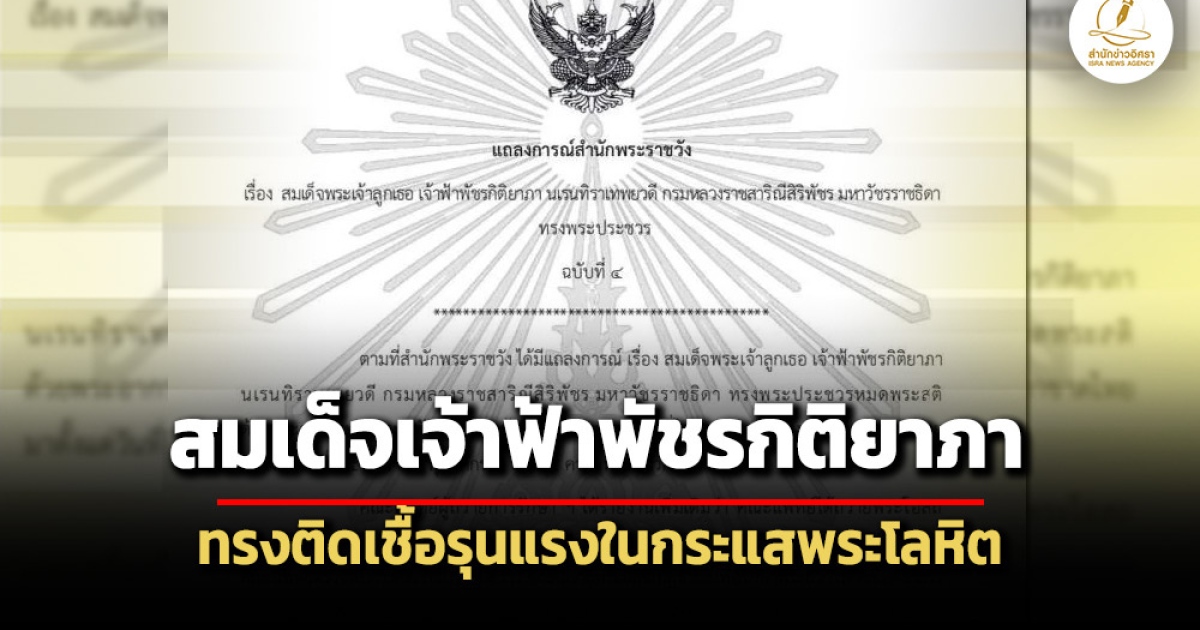 สำนักข่าวอิศรา (www.isranews.org) รายงานว่า เมื่อวันที่ 15 สิงหาคม 2568 สำนักพระราชวังออกแถลงการณ์สำนักพระราชวัง เรื่อง สมเด็จพระเจ้าลูกเธอ เจ้าฟ้าพัชรกิติยาภา นเรนทิราเทพยวดี กรมหลวงราชสาริณีสิริพัชร มหาวัชรราชธิดา ทรงพระประชวร ฉบับที่ 4