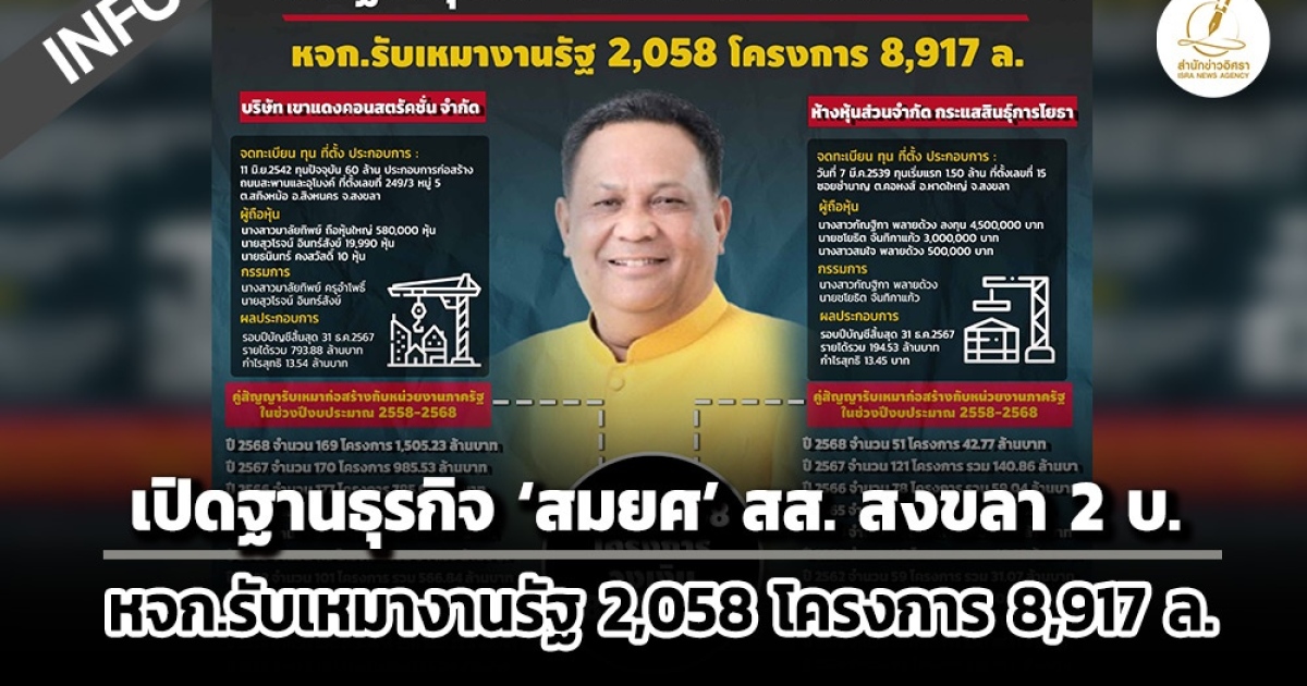 เปิดฐานธุรกิจ ‘สมยศ พลายด้วง’สส. สงขลา 2 บริษัท/ห้างรับเหมา ‘เขาแดงฯ- กระแสสินธุ์การโยธา’ แจ้งงบฯปีล่าสุด 2 แห่งรายได้ 988.4 ล. พบคู่สัญญาหน่วยงานรัฐปี 2558-2568 รวม 2,058 โครงการ 8,917.7 ล้าน มีรายละเอียดดังนี้