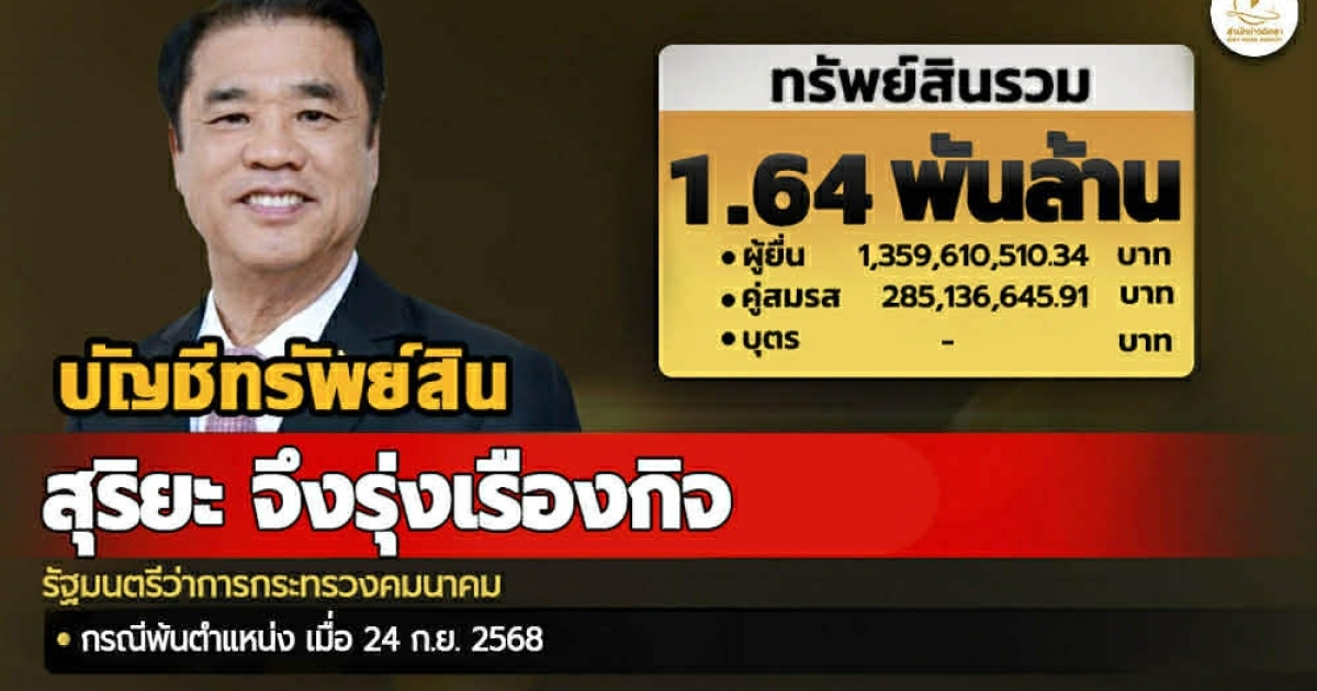 สำนักข่าวอิศรา www.isranews.org เสนอข้อมูลรูปแบบอินโฟกราฟิก บัญชีแสดงรายการทรัพย์สินและหนี้สิน นายสุริยะ จึงรุ่งเรืองกิจ กรณีเข้ารับตำแหน่งรองนายกรัฐมนตรี เมื่อวันที่ 24 ก.ย. 2568 นายสุริยะ และนางสุริสา จึงรุ่งเรืองกิจ คู่สมรส มีทรัพย์สินรวม 1,644,747,156.25 บาท ไม่มีหนี้สิน แบ่งเป็น